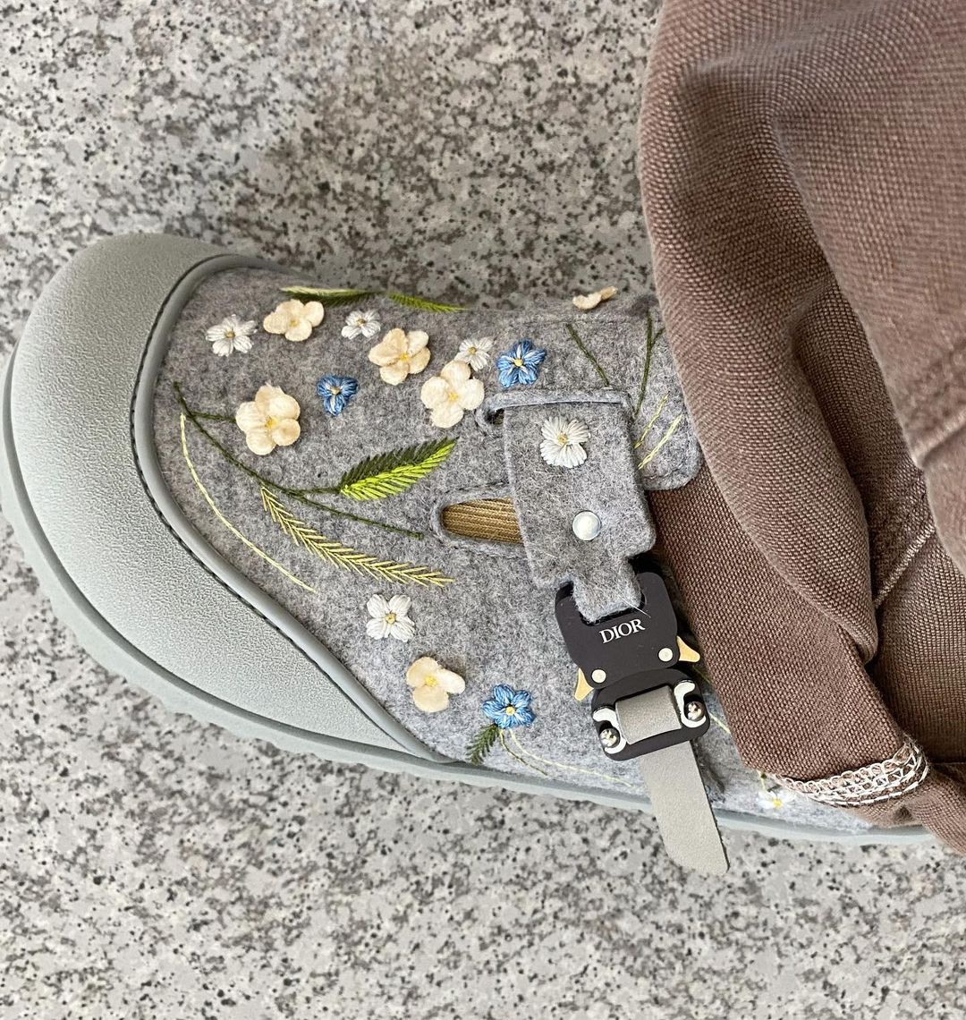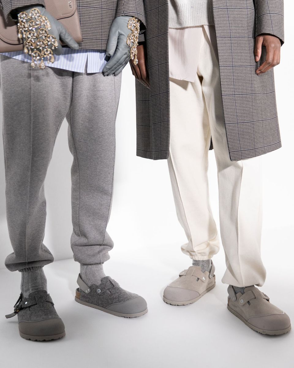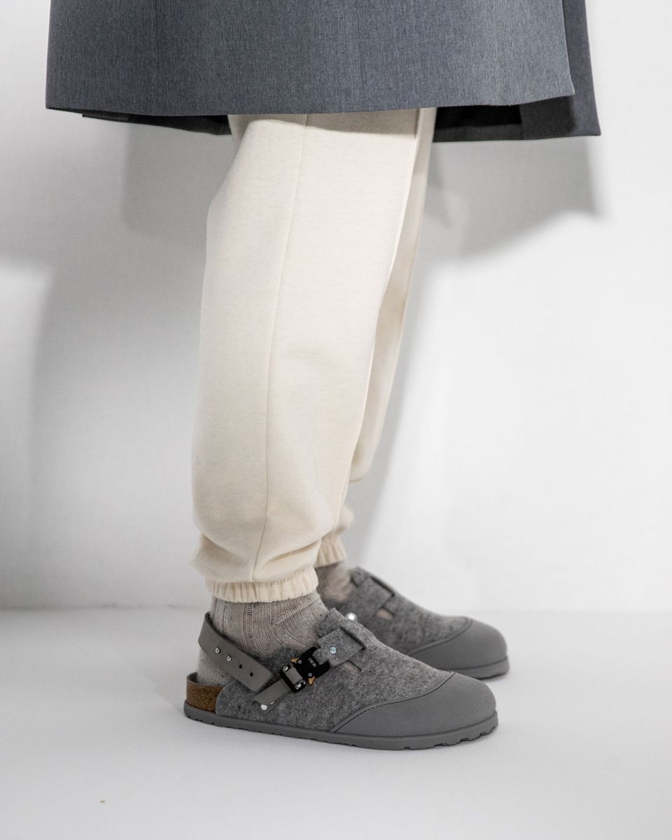 За основу была взята классическая модель Birkenstock Tokio. Обновленные сабо представлены в двух материалах – фетре и коже ягненка. Всего в коллекции появилось четыре расцветки: слоновая кость, молочный шоколад, серая и холодный беж. К одной из вариаций Мэттью Уильямс изящно добавляет цветочную нашивку.