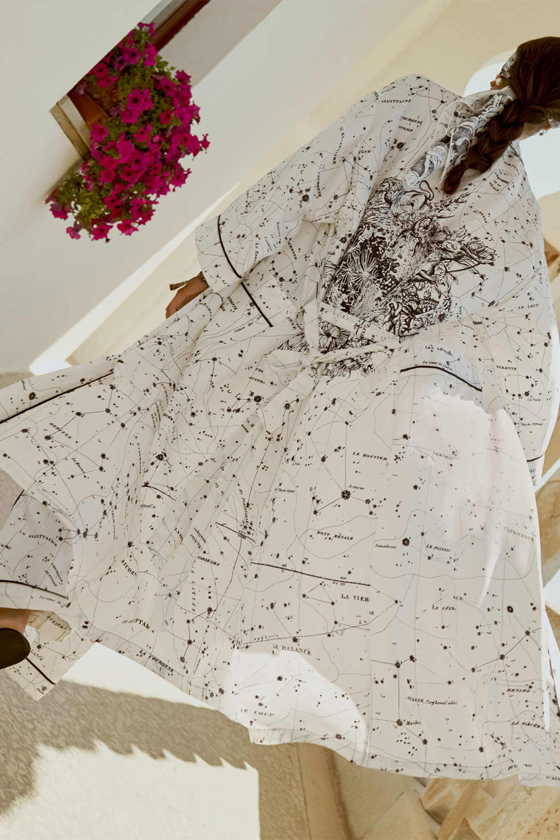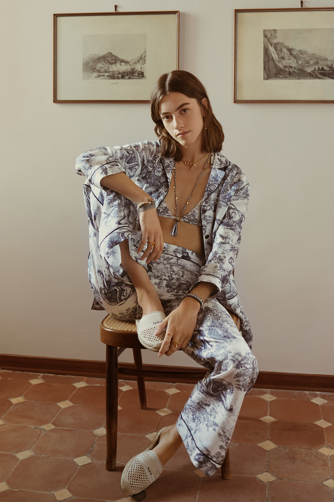 Также в коллекции использован один из отличительных знаков дома — орнамент туаль де Жуи. Его можно найти на пижамных наборах, халатах и пончо.