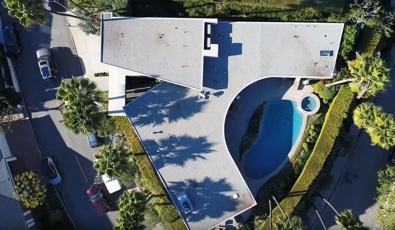 Дом площадью 280 квадратных метров построен в футуристическом стиле в форме полукруга. В нем есть четыре спальни и три ванных комнаты. Панорамные окна открывают вид на центр Лос-Анджелеса и океан, объединяя просторные светлые помещения с экстерьером, утопающим в зелени. Бассейн с видом на город дополнен зоной отдыха с камином.