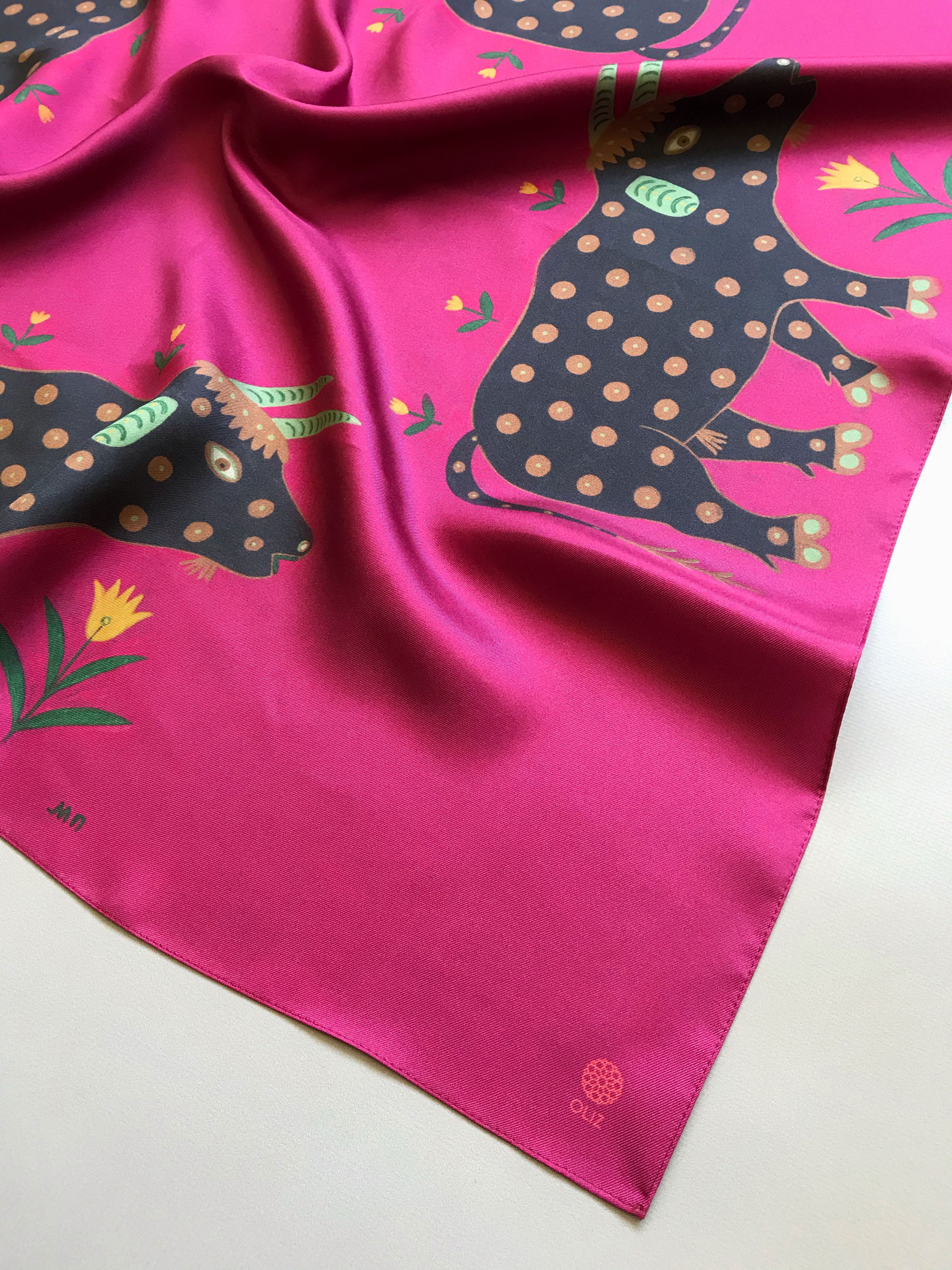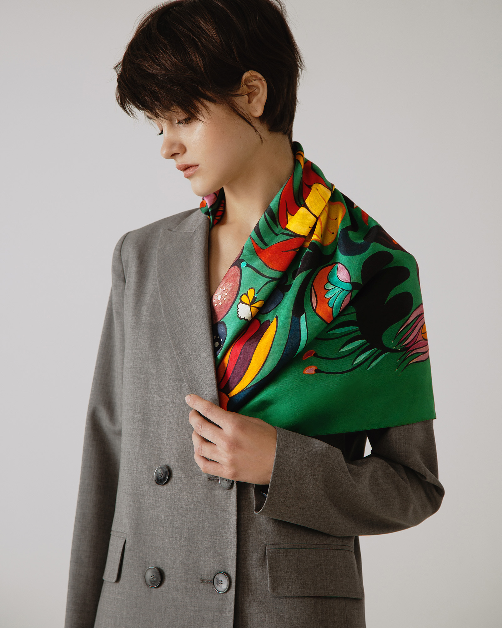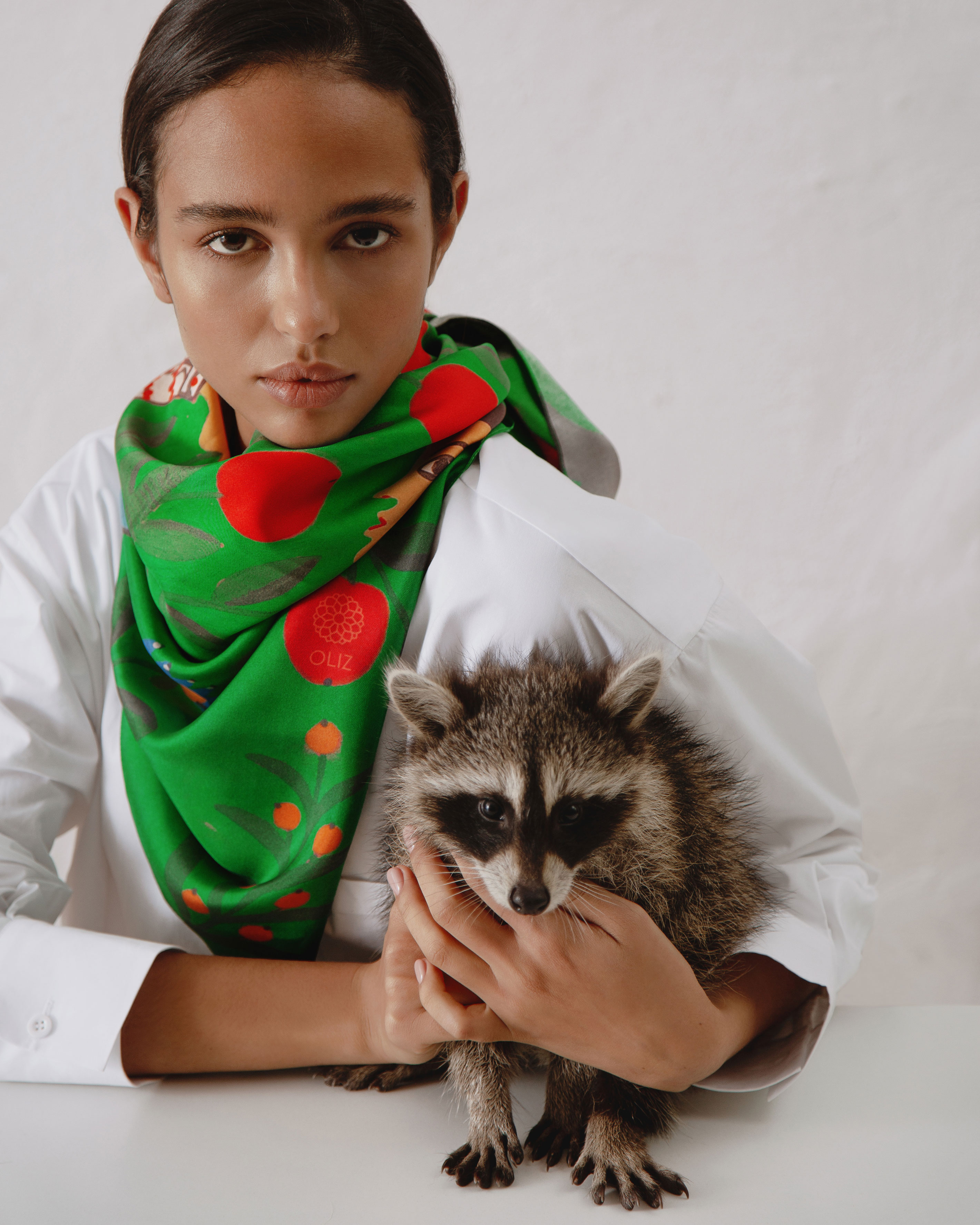 Oliz представили нову колекцію "Казки родини Примаченко". Картини пані Марії, її сина Федора та онука Івана з казковими звірами, фантастичними квітами, делікатними сюжетами були використані на хустинах з італійського шовку твіл.