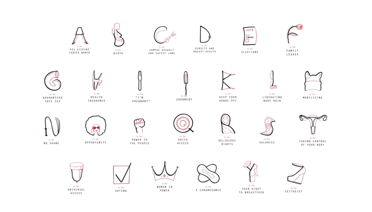 Нью-йоркское рекламное агентство Y&R в коллаборации с организацией предпринимателей Women of Sex Tech, создающей новые техники секса, разработало феминистический шрифт. Каждая буква в нем рассказывает о различных аспектах гендерного равенства.
