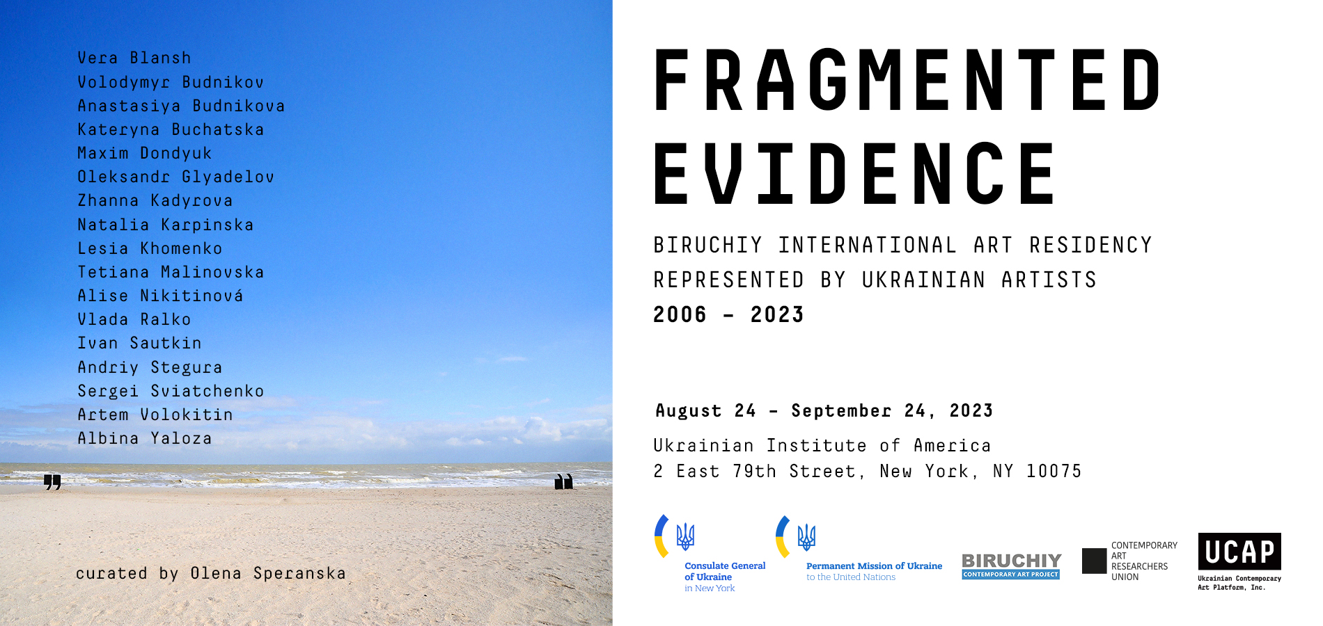 Виставка ФРАГМЕНТОВАНІ ДОКАЗИ відбудеться за підтримки Генерального консульства України в Нью-Йорку та Постійного представництва України при ООН в Українському інституті Америки в Нью-Йорку за адресою: 2 East 79th Street, New York, NY, 10075.