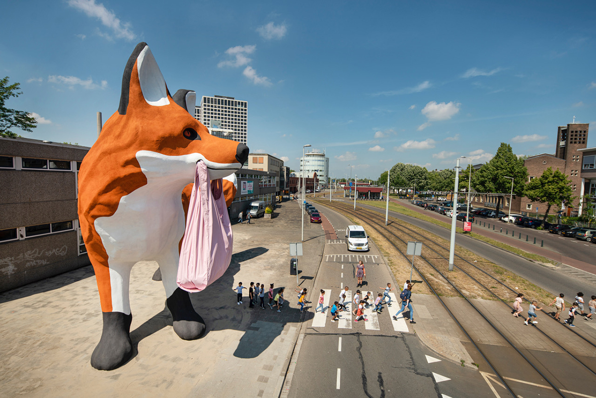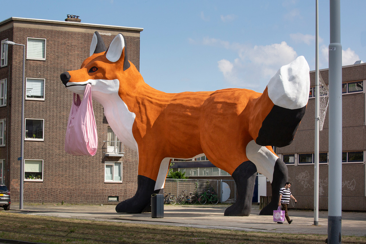 Голландский художник Флорентин Хофман представил новую инсталляцию – громадную скульптуру лисы, держащей пластиковый пакет в пасти. 16-метровая скульптура расположена на перекрестке улиц, разделяющих районы Роттердама (Босполдер и Туссендиккен), где по вечерам обычно можно увидеть лис.