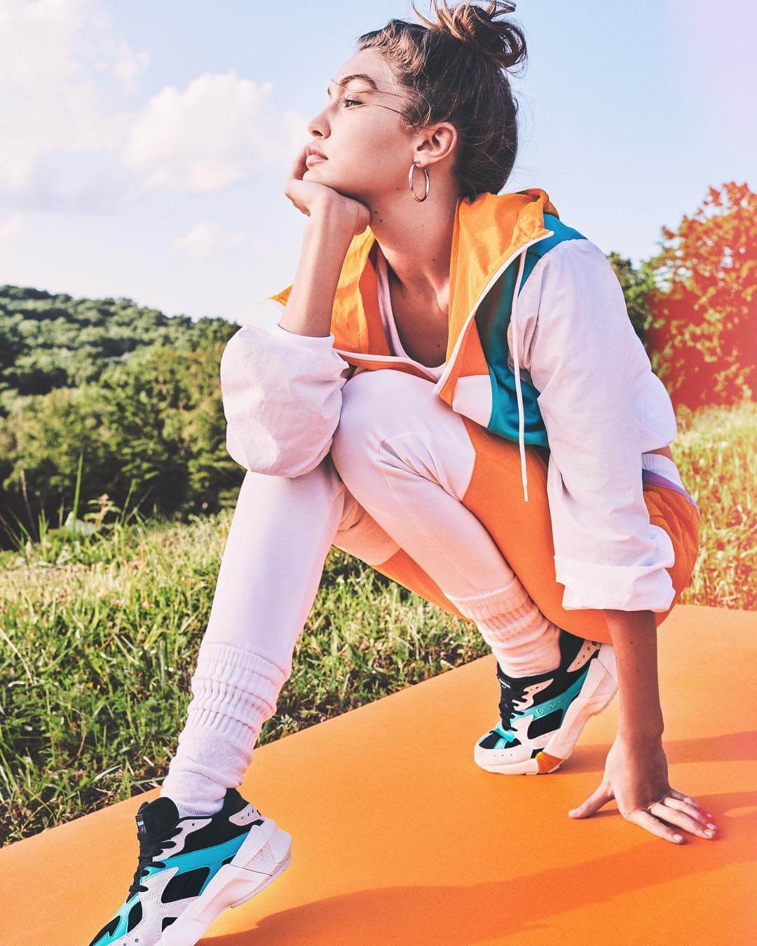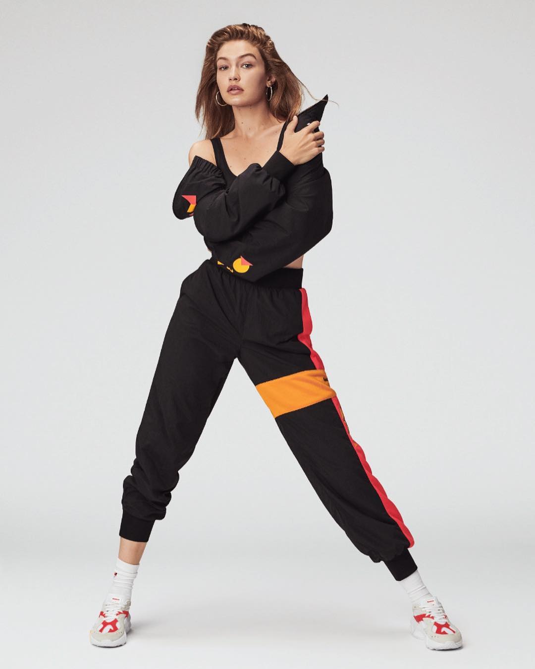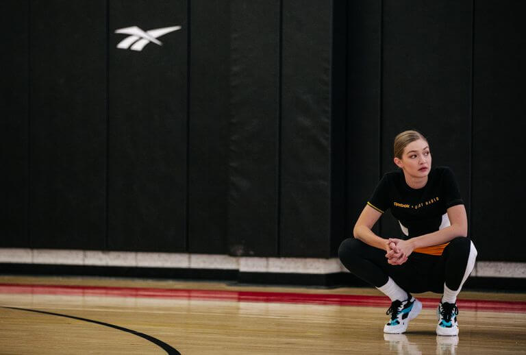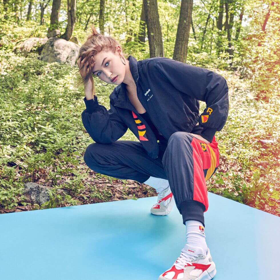Джиджи Хадид создала коллекцию спортивной одежды для Reebok. В нее вошли яркие костюмы в стиле 90-х, худи и толстовки, легинсы, боди, куртки и аксессуары. Вместе с Reebok Джиджи также выпустила кроссовки с массивной подошвой Aztrek Double и Classic в белом, голубом и оранжевом цветах.