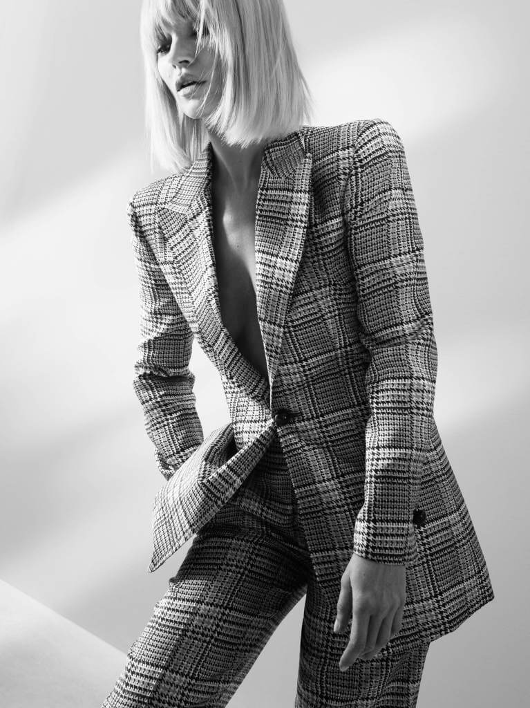 Для осенне-зимней коллекции супермодель позирует в клетчатом приталенном костюме, надетом на голое тело, платье, расшитом пайетками, и комбинезоне цвета индиго.