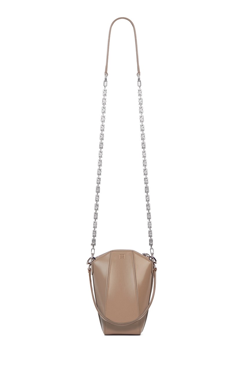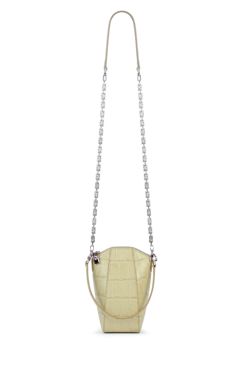 Сумки выполнены из телячьей кожи, в классической версии, а также в вариантах с длинным ремешком и в виде маленькой сумки-бананки. Все модели украшены металлическими акцентами: от длинной цепочки до навесного замка.