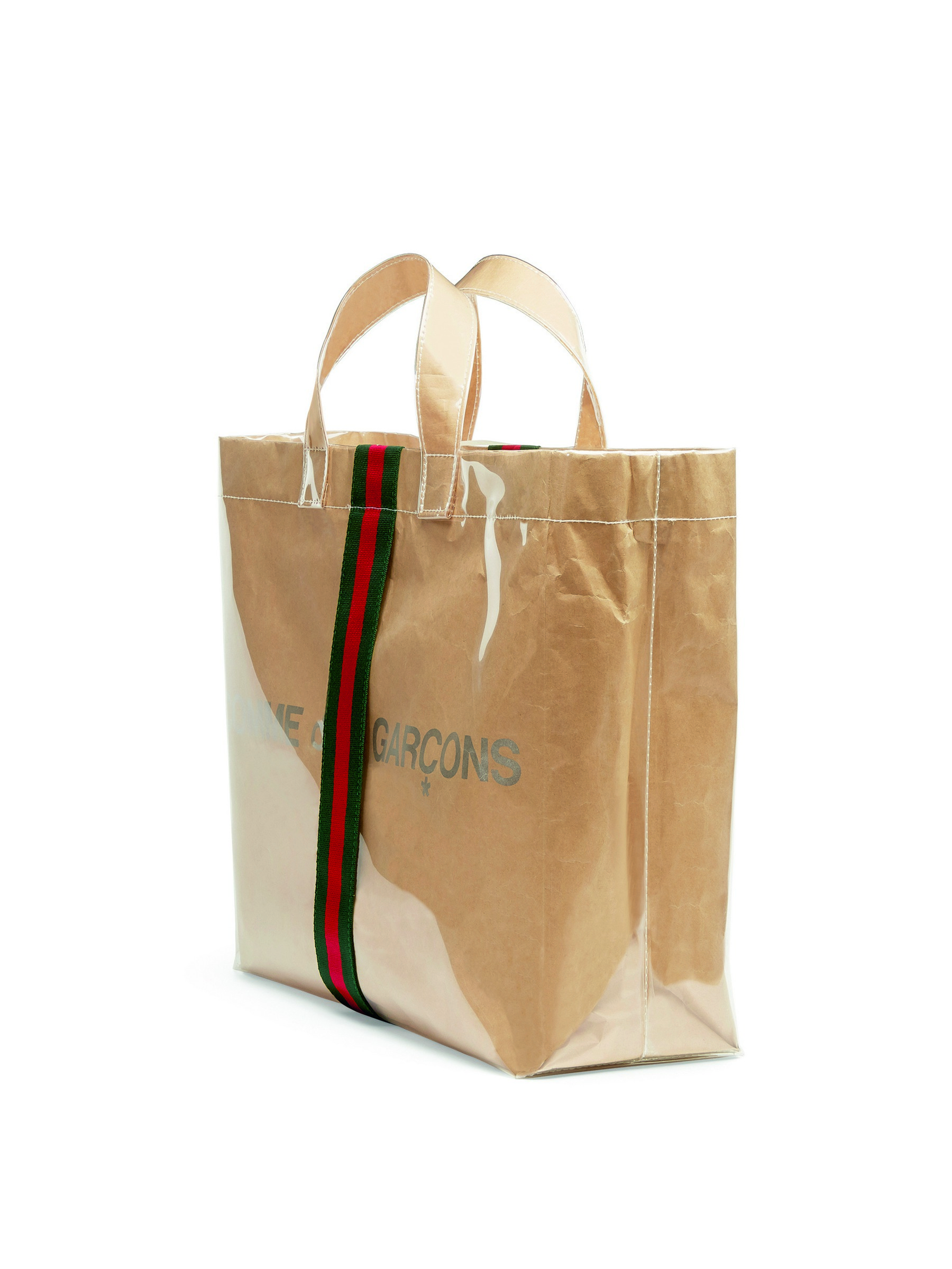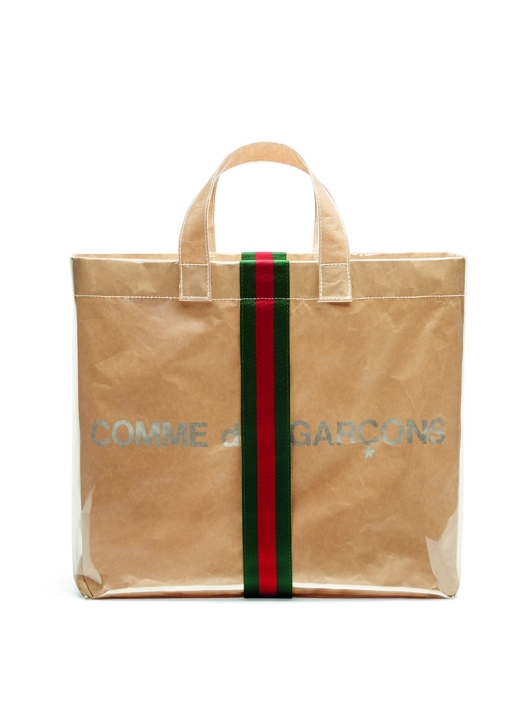 Новая сумка повторяет форму классического шопера Comme des Garçons. Она сделана из переработанной коричневой бумаги, которая напоминает пакеты из супермаркетов. Сверху сумка покрыта пластиком, который придает ей современный и более практичный вид. На шопере также появился двойной брендинг: неброская серебристая надпись Comme des Garçons, сверху покрытая вертикальной зелено-красной полосой Gucci из ткани.