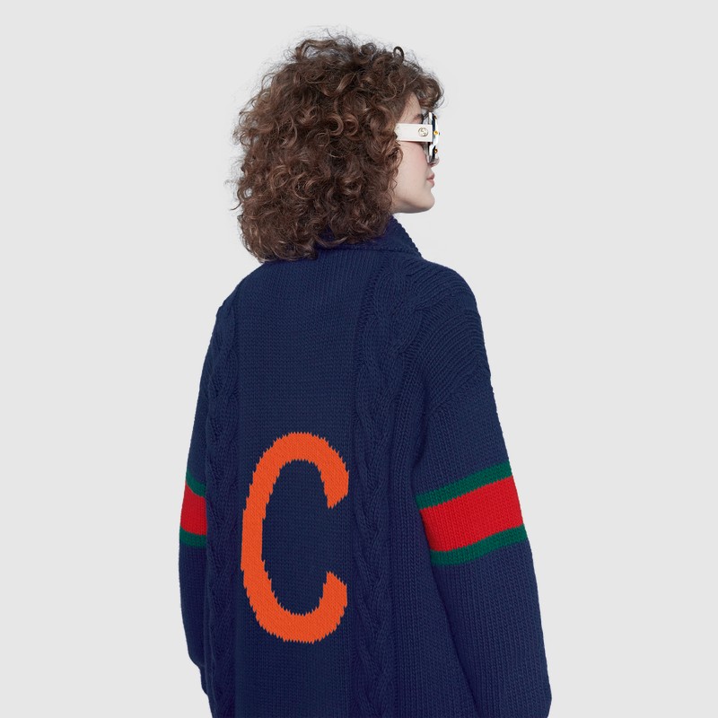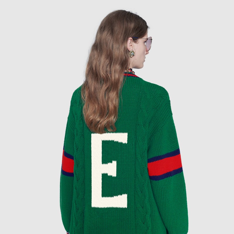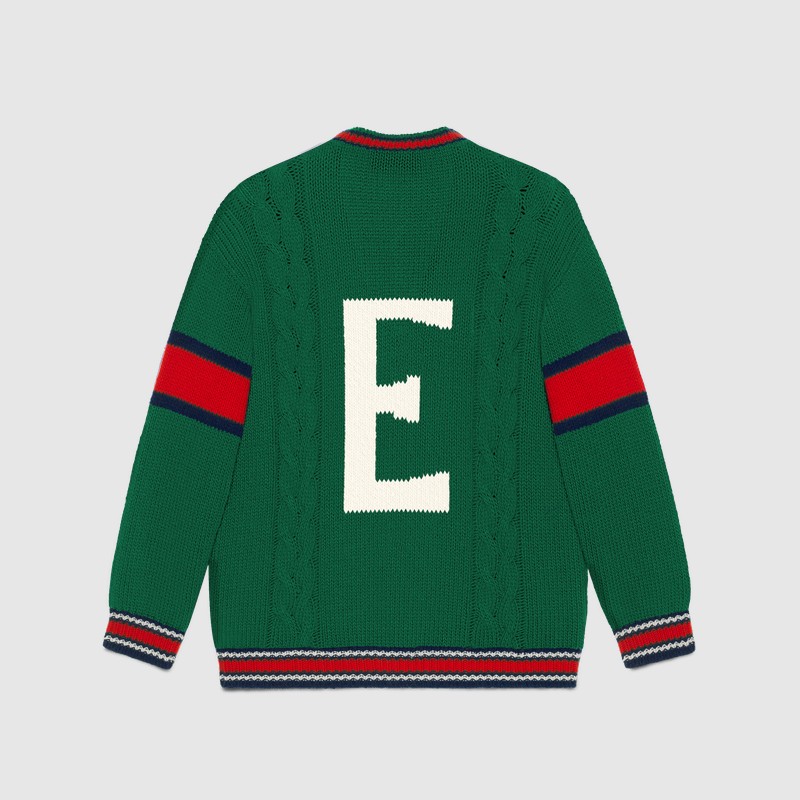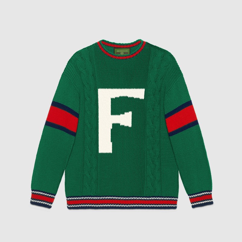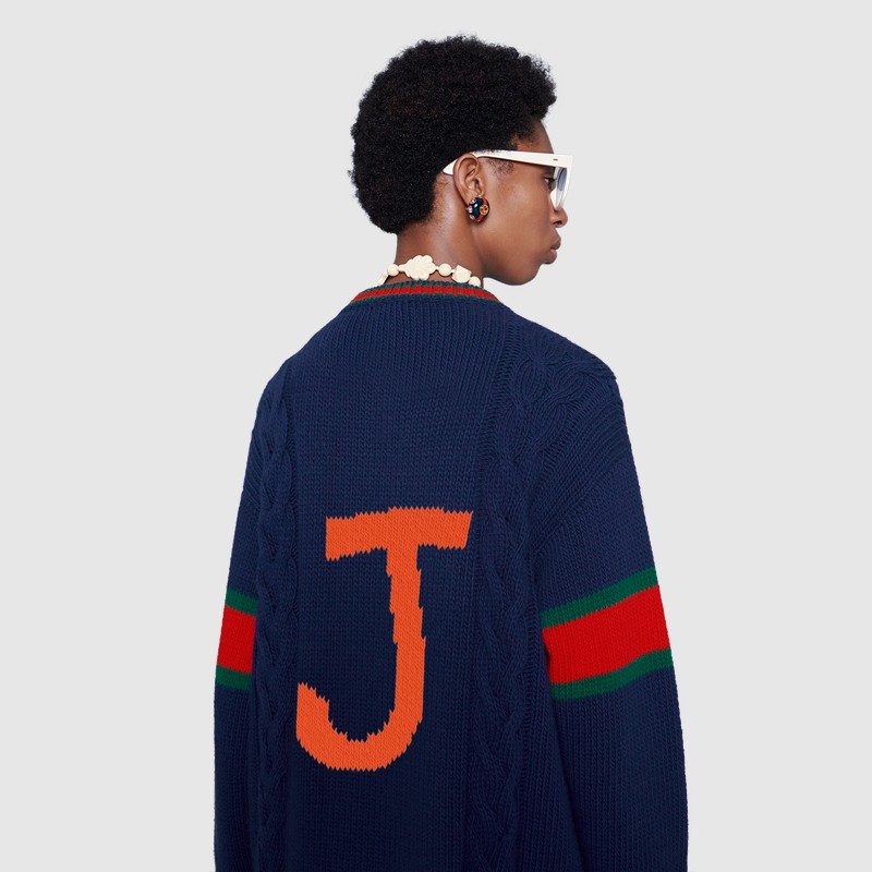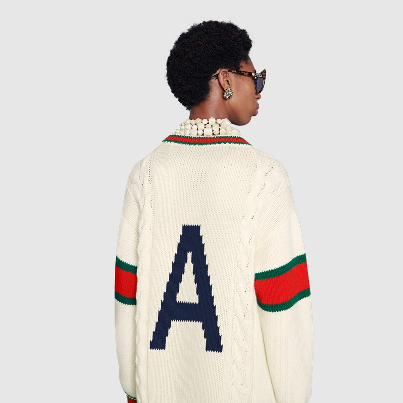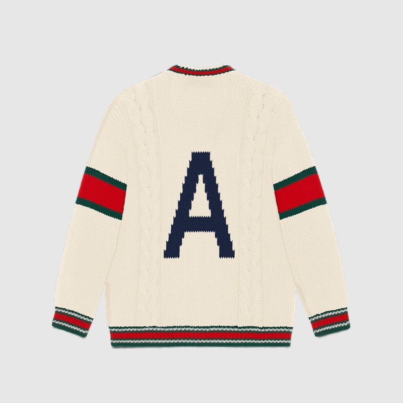 Из трикотажных вещей в программу персонализации вошли вязаные шерстяные свитера, бомберы с воротниками и кардиганы в зеленом, синем, красном и белом цветах. На них можно будет вывязать букву и заменить патчи украшениями. Фирменный логотип GG на бирке каждой персонализированной вещи будет сопровождаться надписью ABCDEFGUCCI.