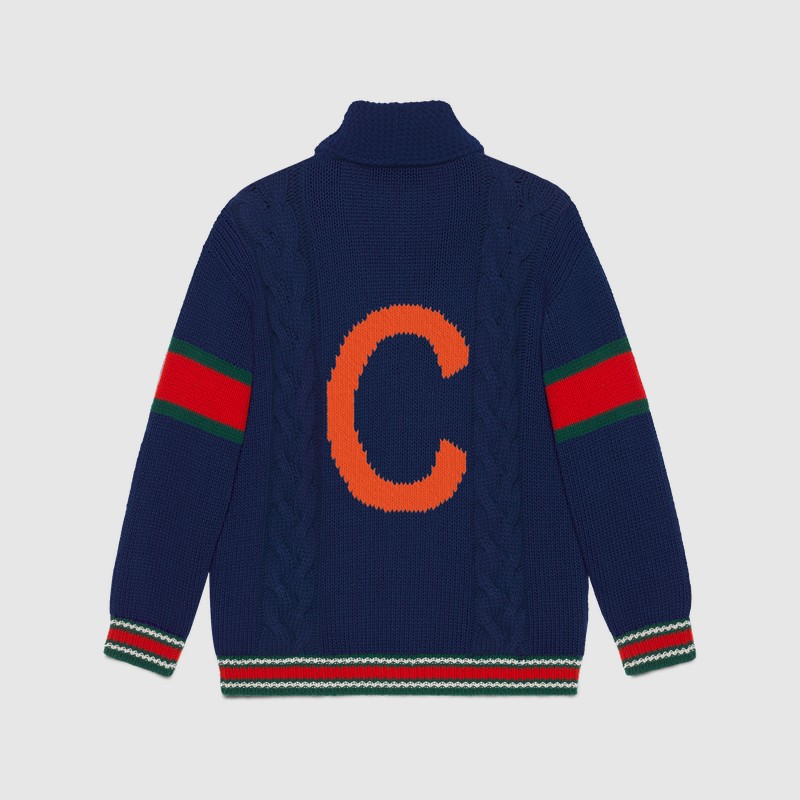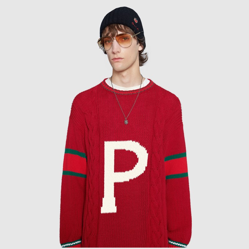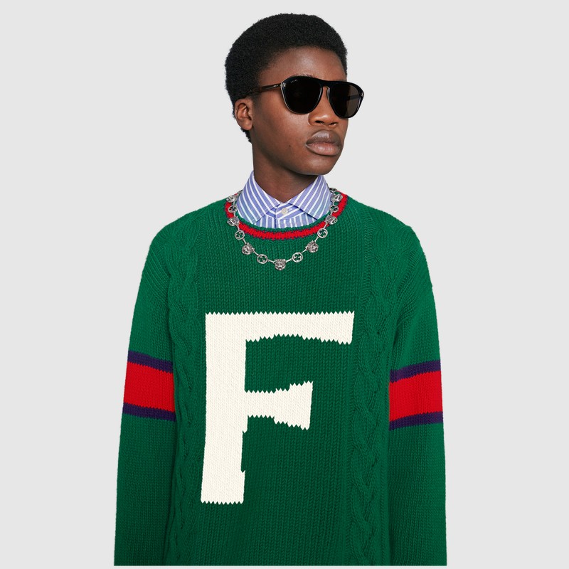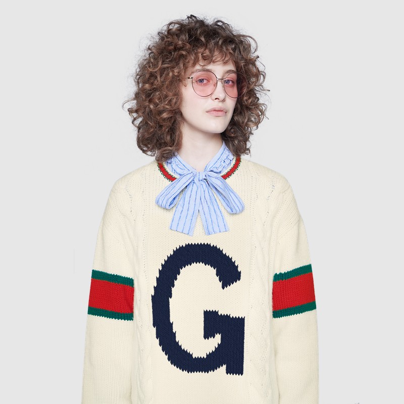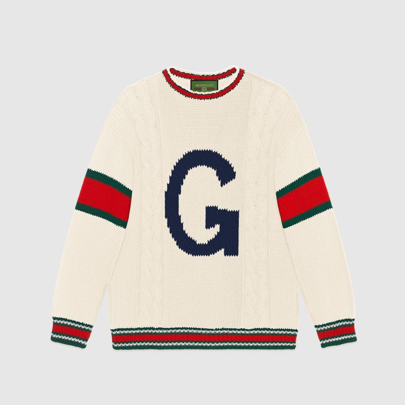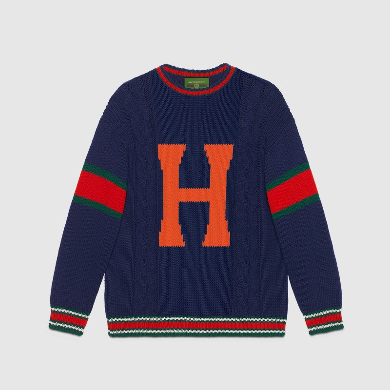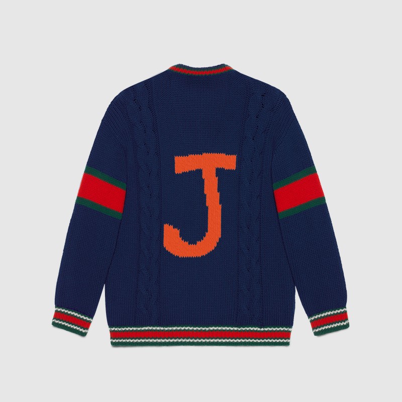 Из трикотажных вещей в программу персонализации вошли вязаные шерстяные свитера, бомберы с воротниками и кардиганы в зеленом, синем, красном и белом цветах. На них можно будет вывязать букву и заменить патчи украшениями. Фирменный логотип GG на бирке каждой персонализированной вещи будет сопровождаться надписью ABCDEFGUCCI.