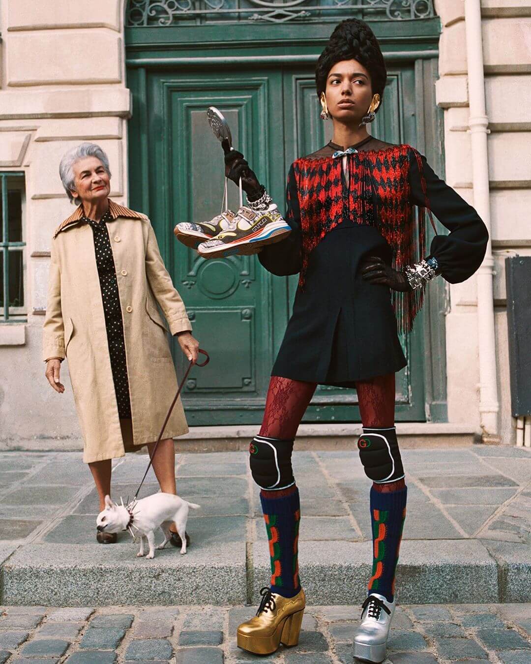“Кампания описывает путешествие сквозь сезонное колесо моды: моделей застают врасплох на улице, за кулисами, когда они шагают между передними рядами и демонстрируют преувеличенные театральные позы в студии фотографа”, — пишет официальный сайт Gucci.