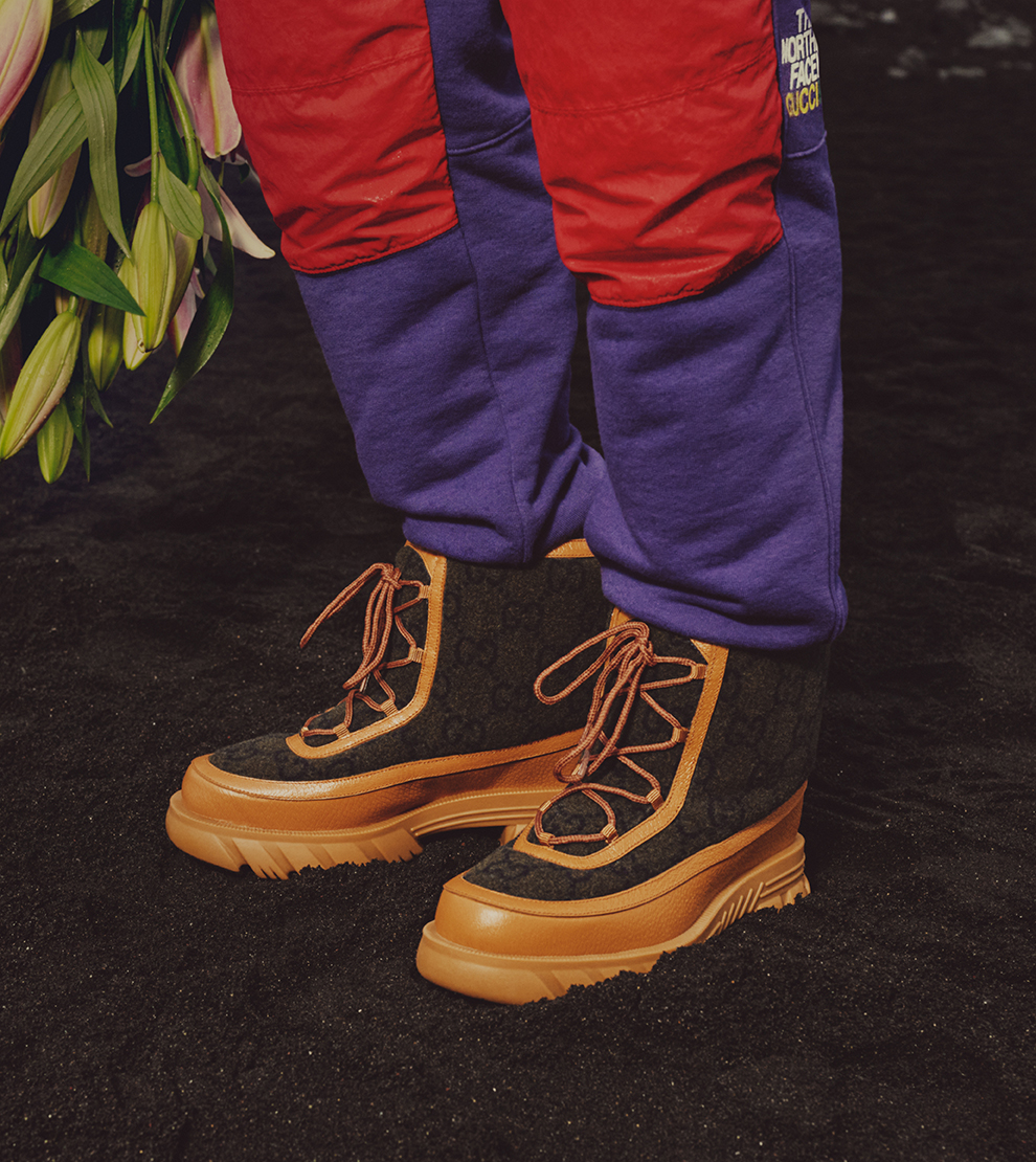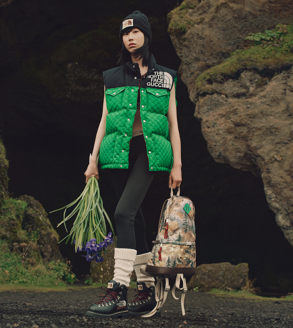 Коллекция для мужчин и женщин включает в себя готовую одежду, аксессуары и обувь, в том числе такие предметы, как походные ботинки, рюкзаки со множеством карманов и утепленные куртки для активного отдыха The North Face, а также бомберы и жилеты с монограммой GG. Линейку дополнили и классическими моделями The North Face 90-х годов, украшенными яркими принтами. Некоторые из них вдохновлены архивом Gucci.