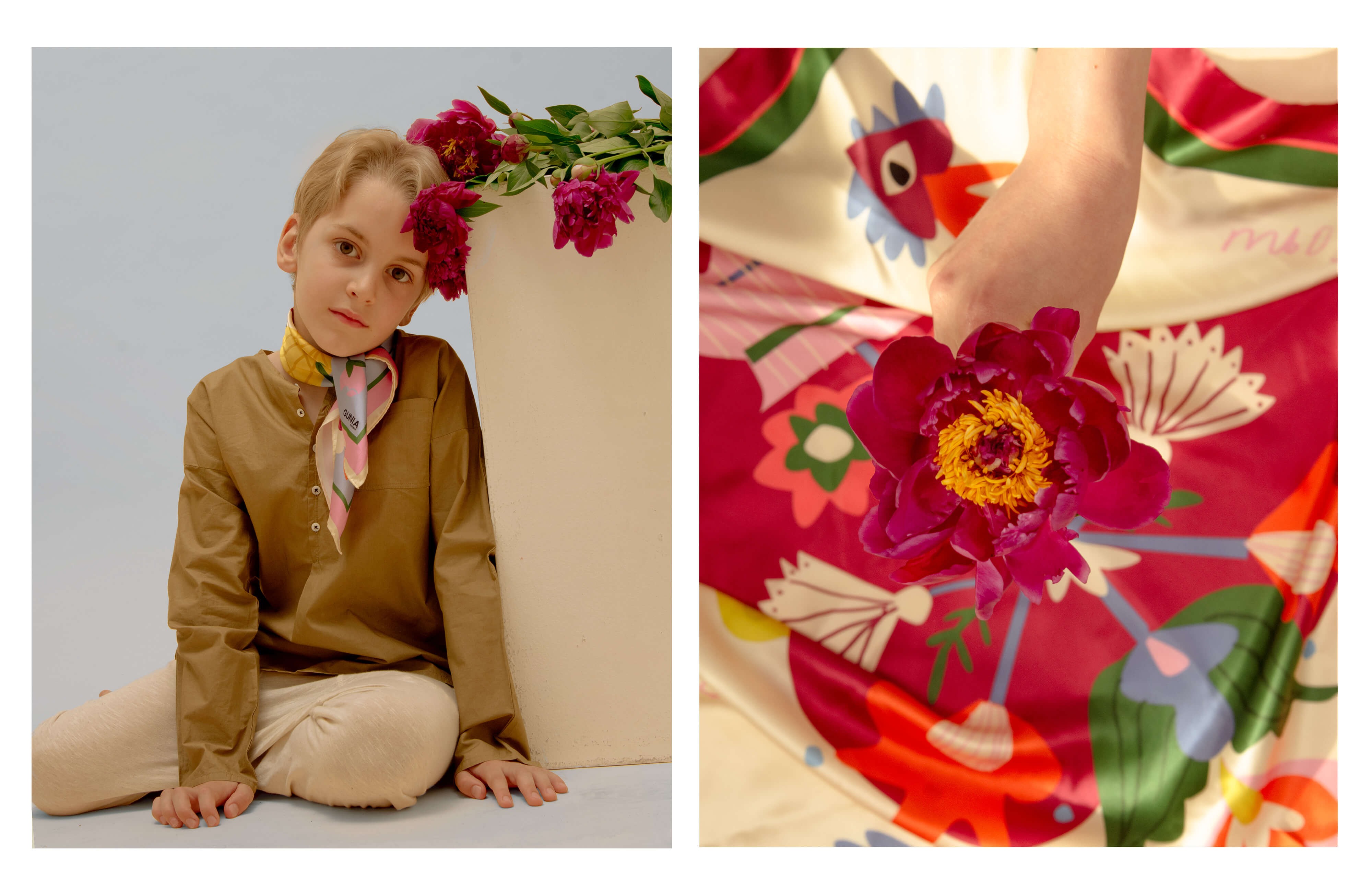 В капсулу вошло 3 модели каре в большом и маленьком размерах, рисунки на которых вдохновлены украинским наивным искусством. На них изображены “древо жизни”, птицы, цветы и животные. Отдельная опция, которую бренд собирается ввести в обычную практику, — персонализация. Каждый из платков можно заказать с нанесением своего имени, имени ребёнка или всей семьи, что перекликается с аутентичной традицией вышивки имен на рушниках-оберегах.