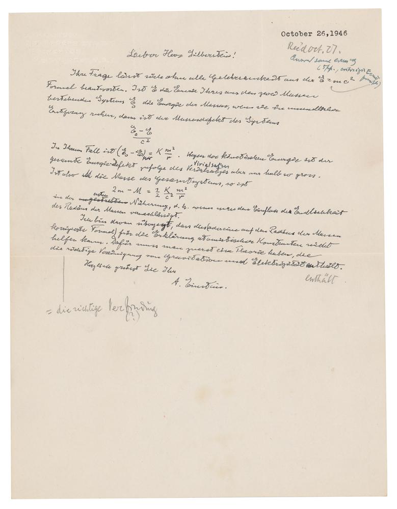 Одностраничное письмо на немецком языке было написано ученым физику Людвику Зильберштейну 26 октября 1946 года. Зильберштейн был известным критиком и противником некоторых теорий Эйнштейна.