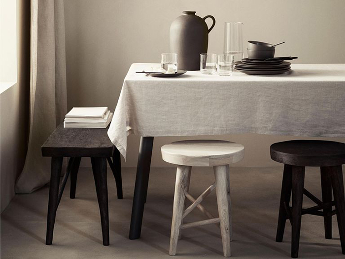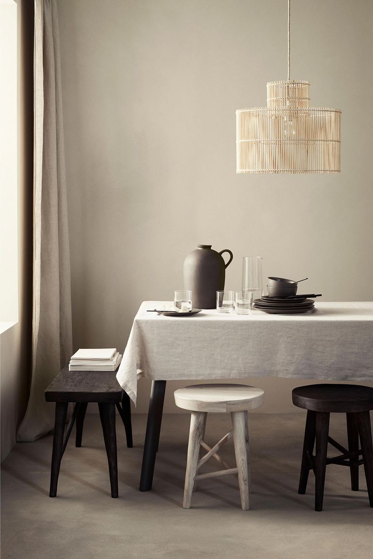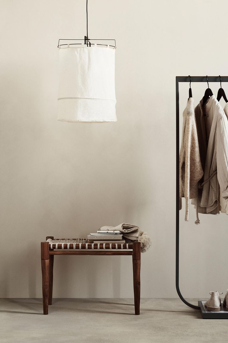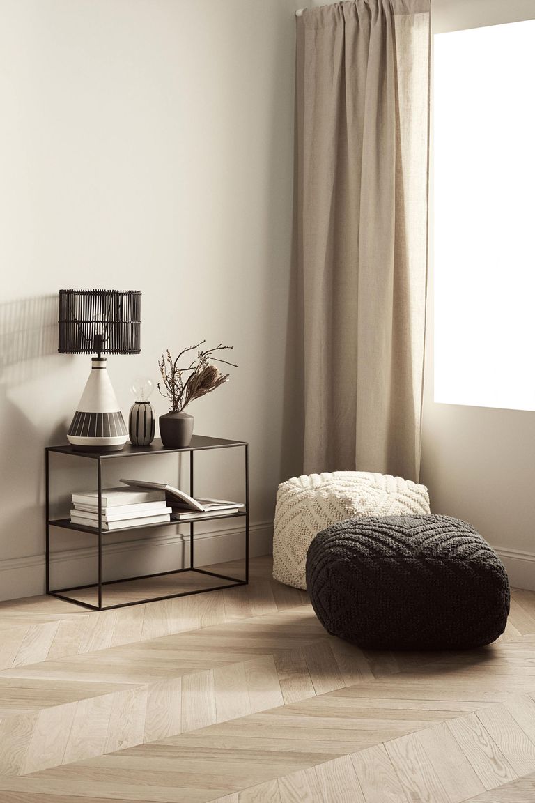 H&M представили свою первую коллекцию мебели и освещения для дома. Среди предметов — пуфы, столы, скамьи, табуреты, настенные полки, а еще светильники — настольные лампы, бамбуковые и хлопковые плафоны.