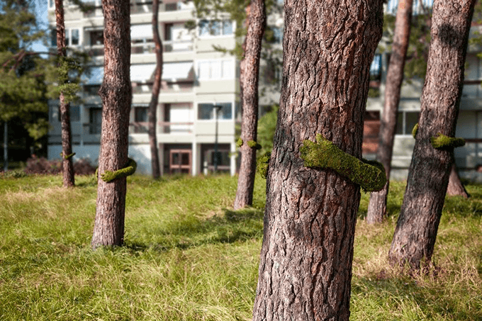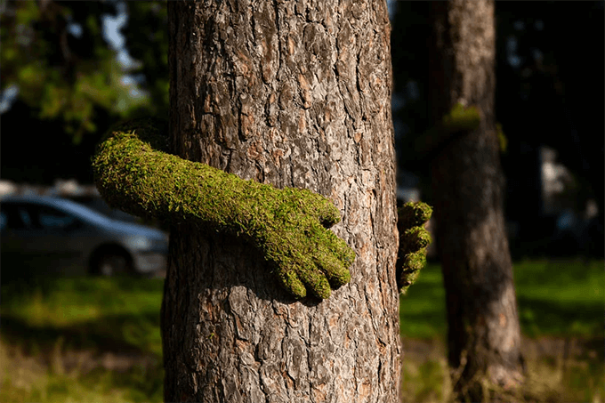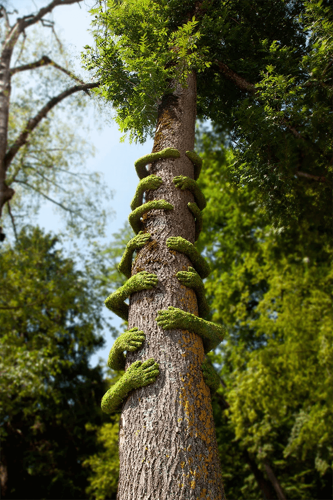Гине часто называют “Мсье Растение”, он не устает напоминать людям, как важно любить природу, и делает это творческим и очень милым путем. Ботаник создал инсталляции в сотрудничестве с местными жителями. Макеты рук, украшенные зелеными растениями, обнимают деревья как символ слияния человека и природы.