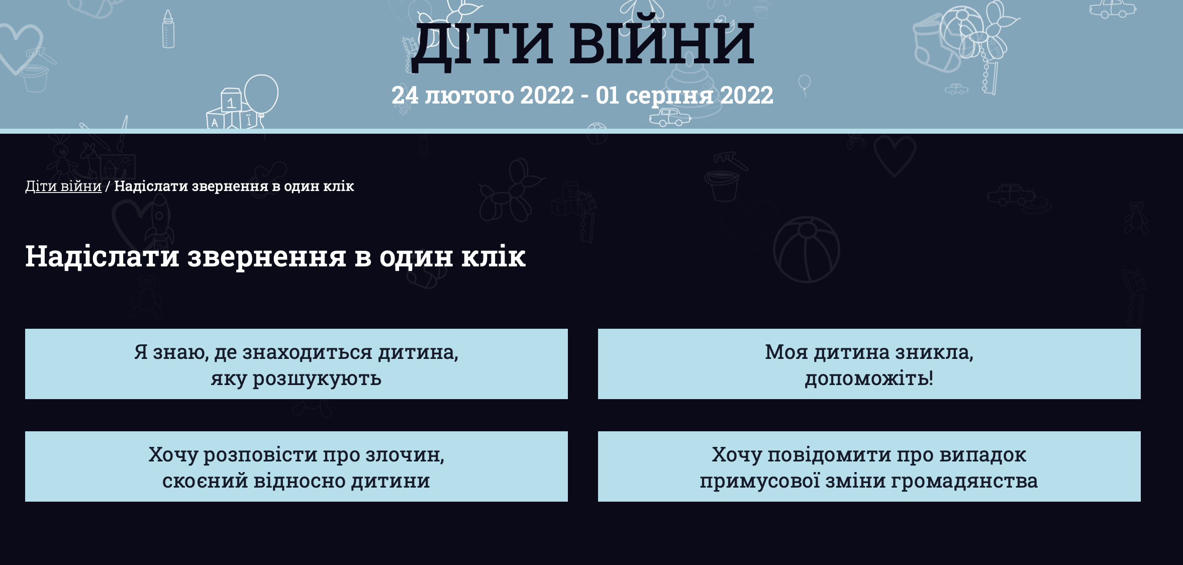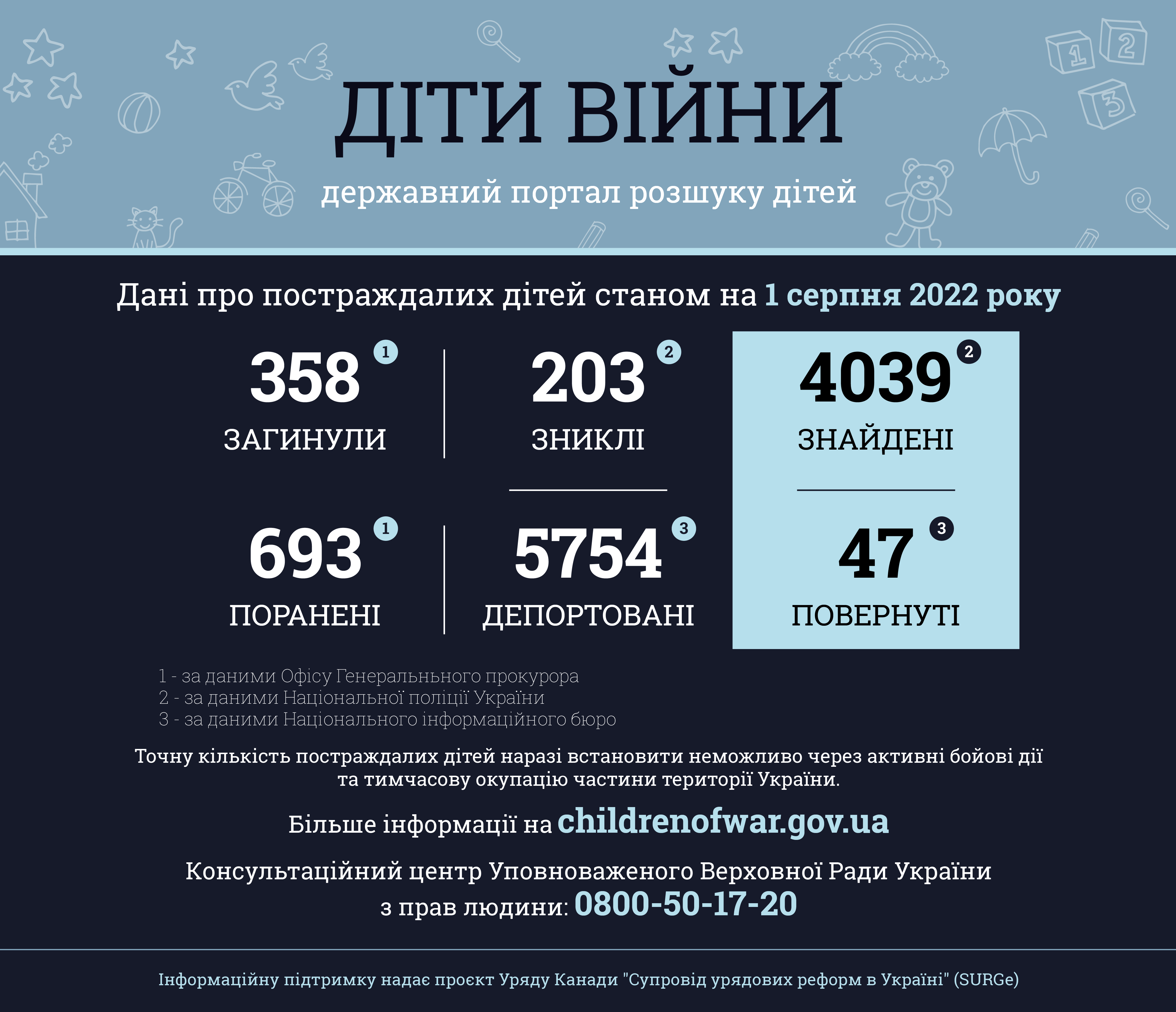 1 серпня почала роботу державна інформаційна платформа “Діти війни”, яка допомагатиме батькам та правоохоронним органам збирати інформацію про дітей, які постраждали під час війни, зокрема зникли безвісти або були незаконно депортовані до росії.