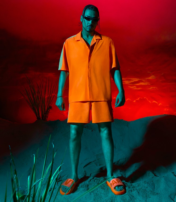 Все модели выполнены в оранжевом цвете, со знаковыми тремя белыми полосками. В коллекцию вошли плавки, бикини, слитные купальники, футболки, сумки, вьетнамки и шляпы. Размерная сетка коллекции — от XS до 4XL.