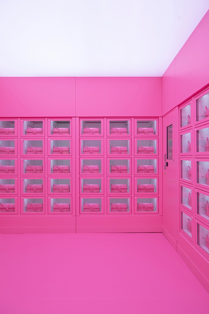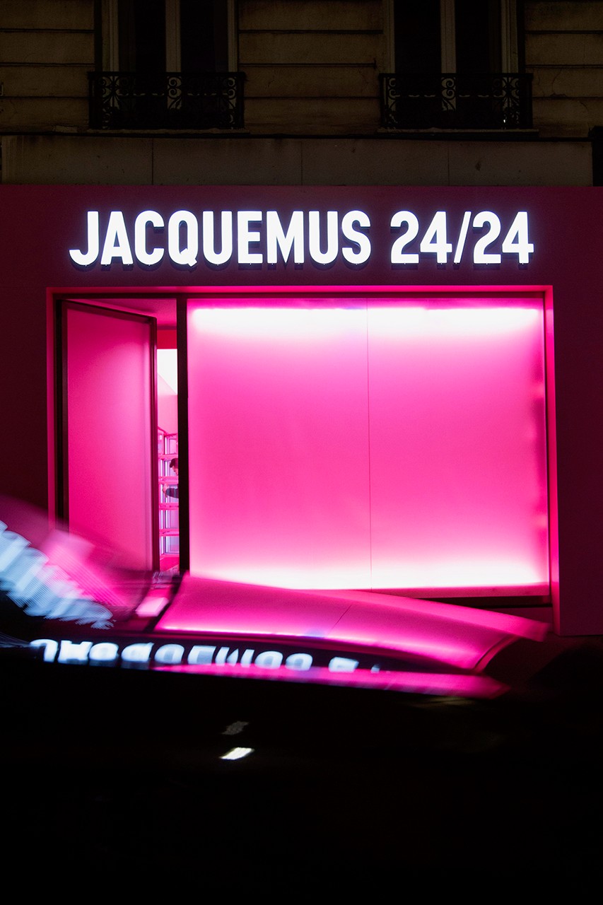 В центре Парижа Симон Порт Жакмюс открыл полностью розовый поп-ап. В нем дизайнер представил аксессуары из последней монохромной коллекции Jacquemus: сумку Bambino Long, панамы и шарфы. Предметы помещены в прозрачные механические ячейки, которые открываются только после их приобретения на специальном автомате.