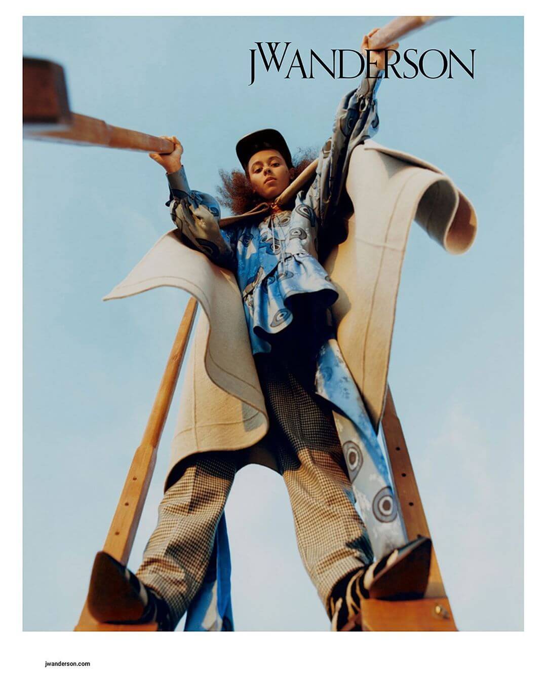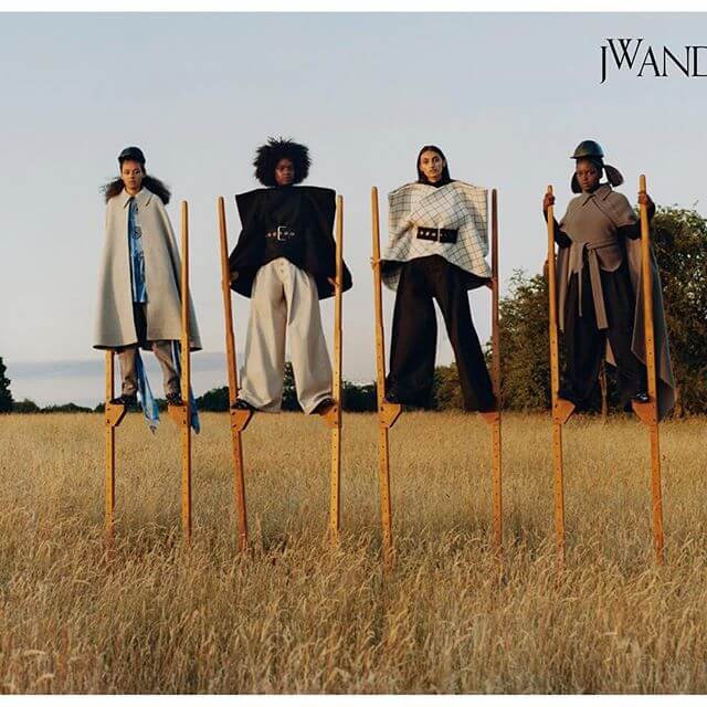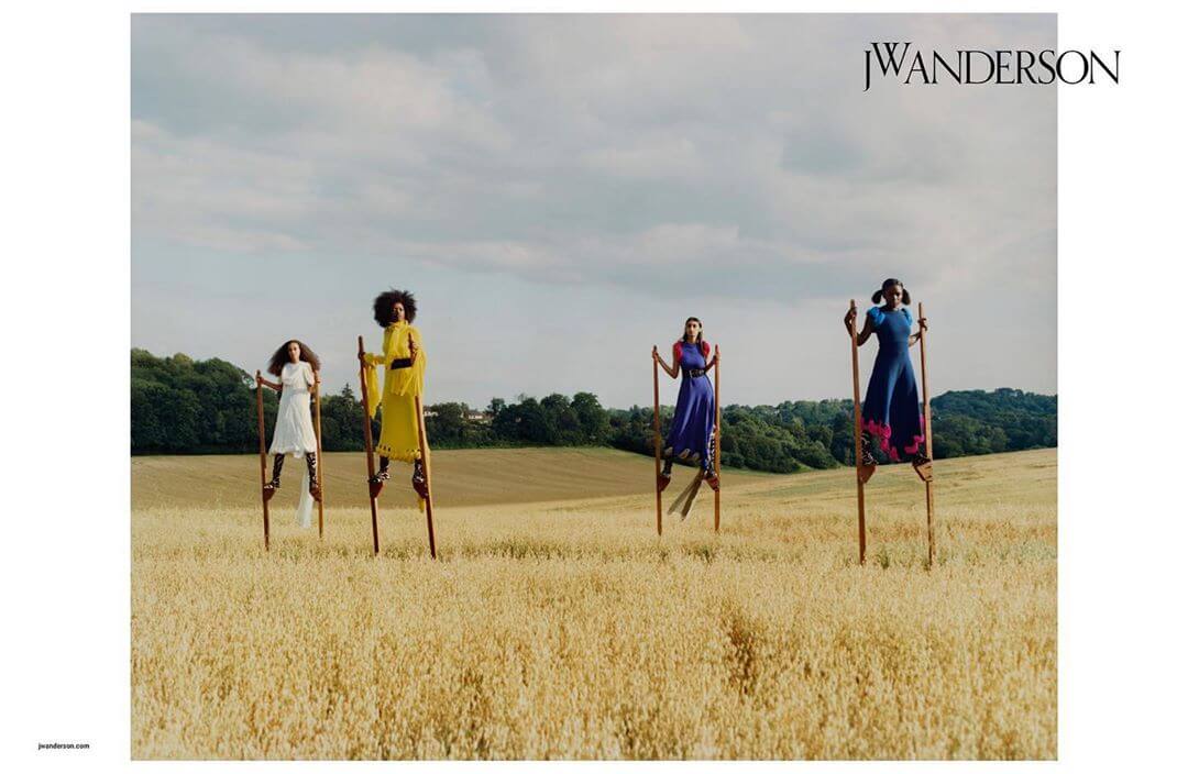 В новой рекламной кампании британского бренда JW Anderson появились модели, позирующие среди поля на ходулях и в вещах из осенне-зимней коллекции марки. Снимал кампейн афроамериканский фотограф и режиссер Тайлер Митчелл.