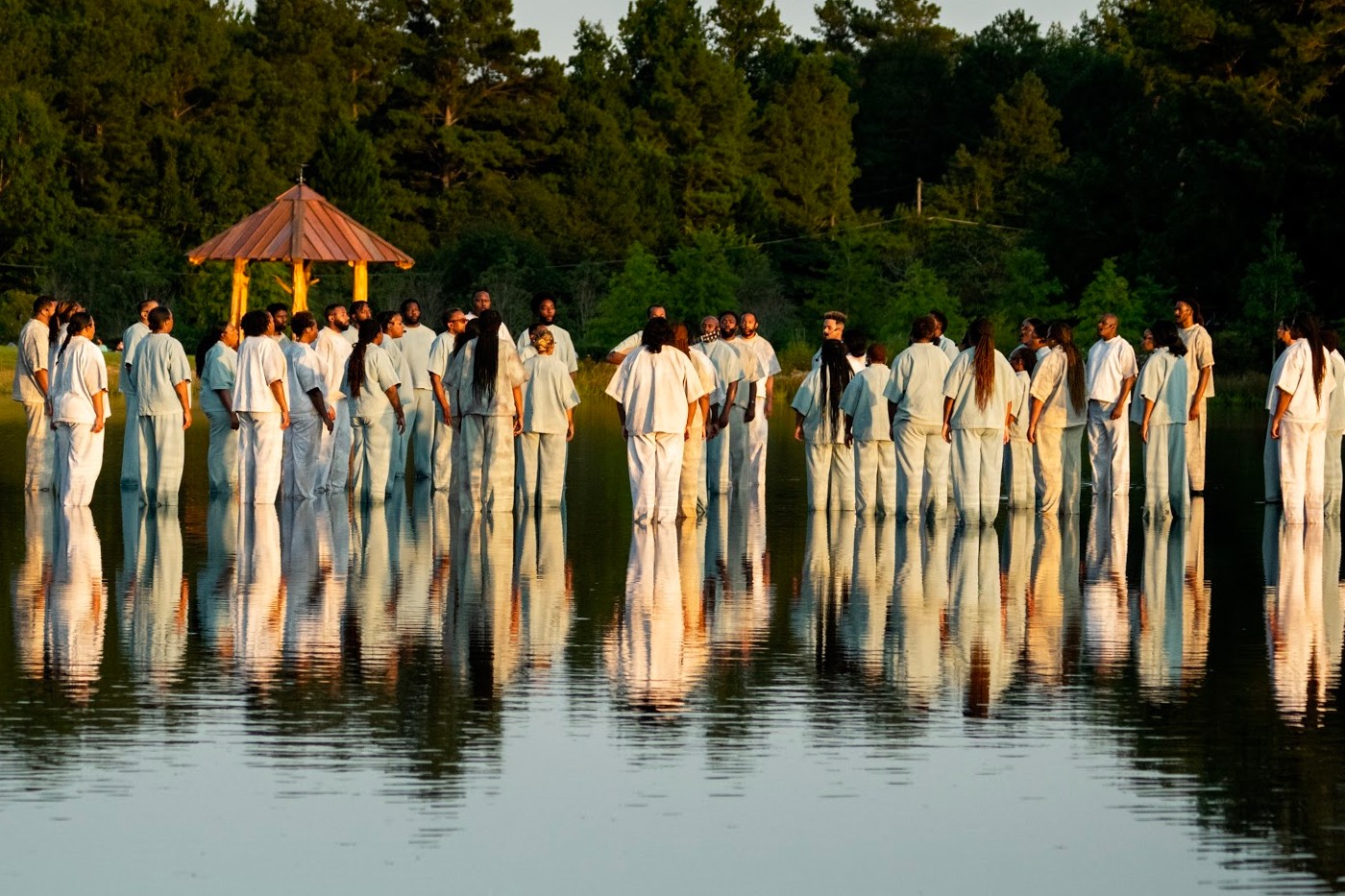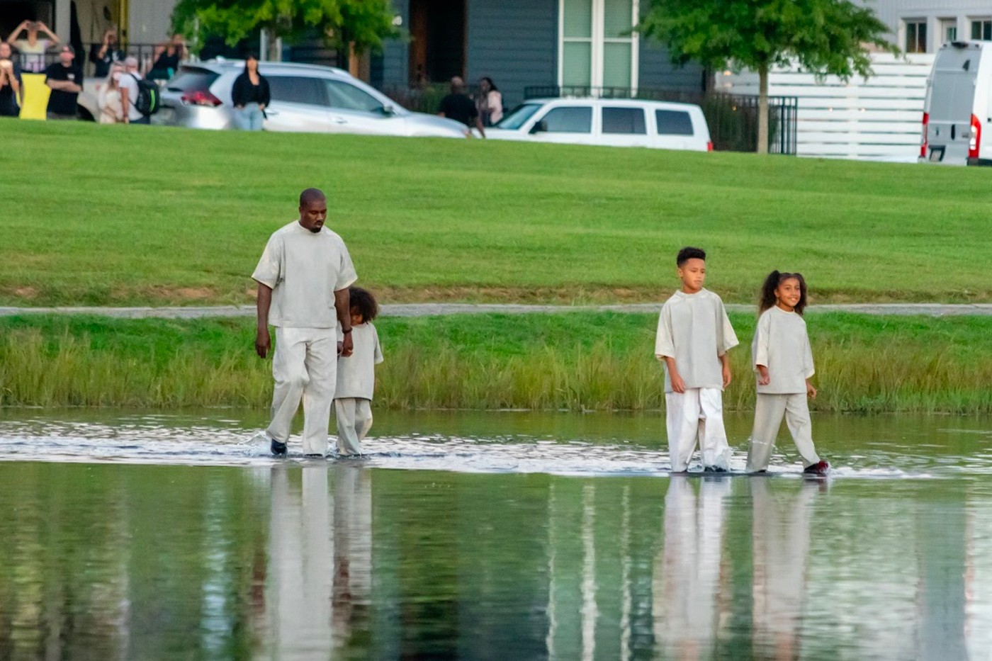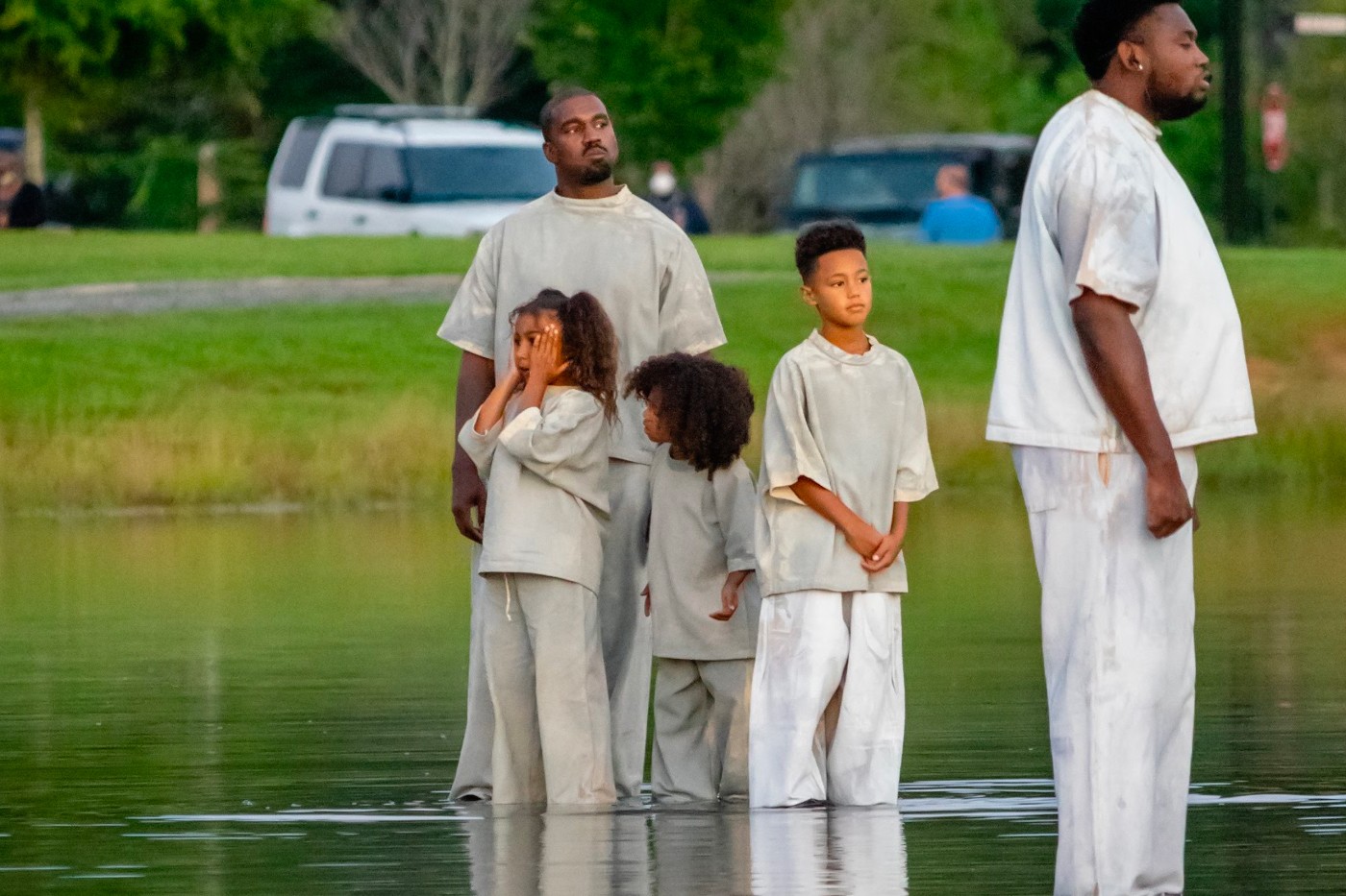 После проповеди Остина Канье со своими детьми, вместе с церковным хором, воспроизвели библейскую историю наглядно. Одетые в серые костюмы, они прошлись по неглубокому водоему в окружении голубей и в сопровождении песнопений, создавая божественный эффект.