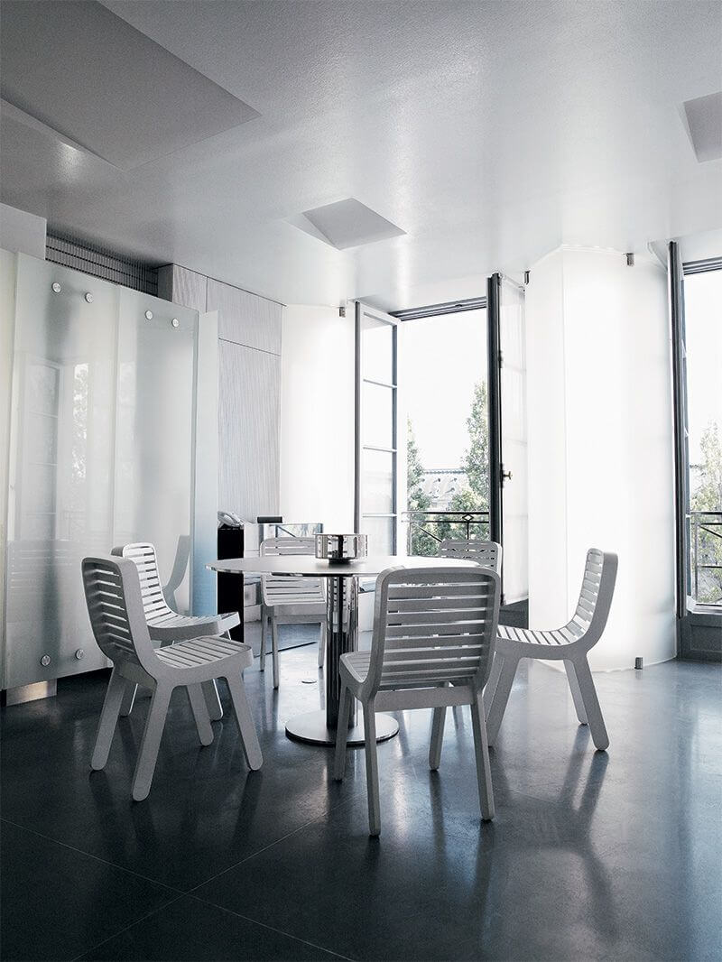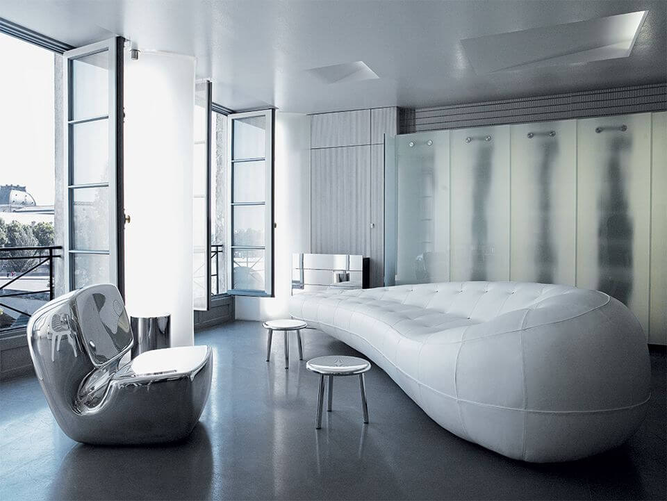 В 2000-х годах дизайнер жил в современной квартире в Париже — белоснежные интерьеры дополняла футуристическая мебель и акценты из металла.