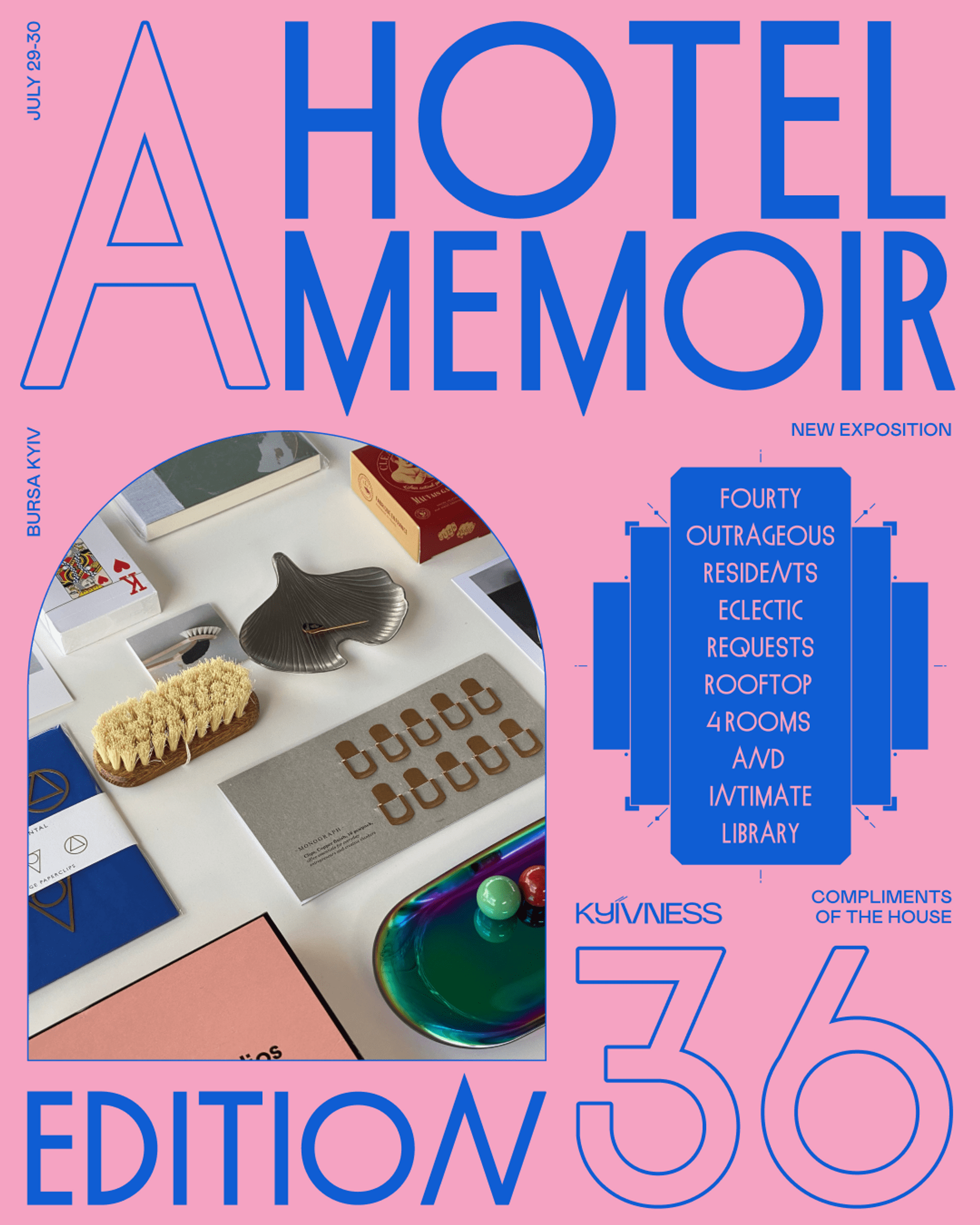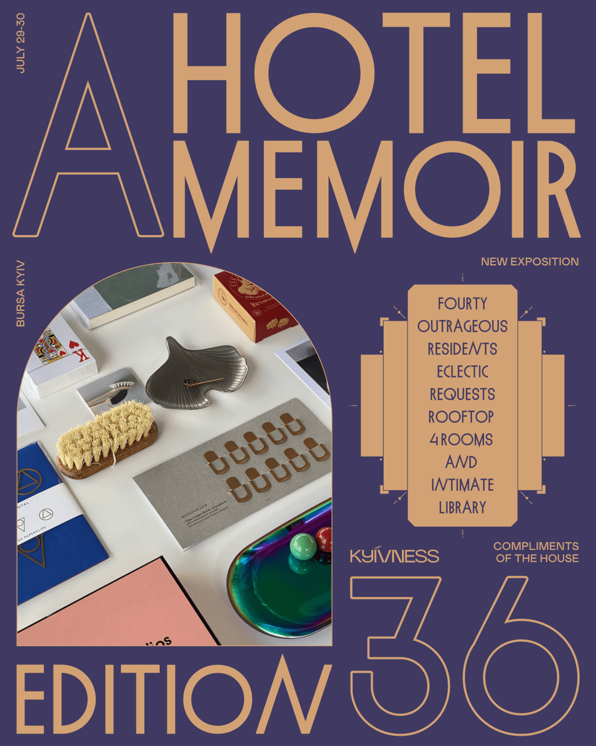 Липневий маркет A HOTEL MEMOIR пропонує киянам та гостям столиці найцікавіші вінтажні та локальні проєкти. Серед вінтажних – кращі знахідки з секретних корнерів Парижа, Берліна, Нью-Йорка та інших міст. Серед артефактів можна буде знайти: Christian Dior, Chloe, Maison Margiela, добірку рідкісних годинників.