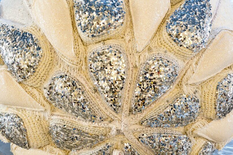 Португальская художница и дизайнер Джоана Васконселос создала 30-метровую инсталляцию в парижском универмаге Le Bon Marché. Работа называется “Валькирия”, в честь героини скандинавской мифологии, которая определяет жизнь и смерть в бою. Скульптура сделана из блесток, кружев, бахромы, жемчужин и лампочек и охватывает центральное пространство универмага, в том числе эскалаторы. Работу Васконселос посвятила женской силе.