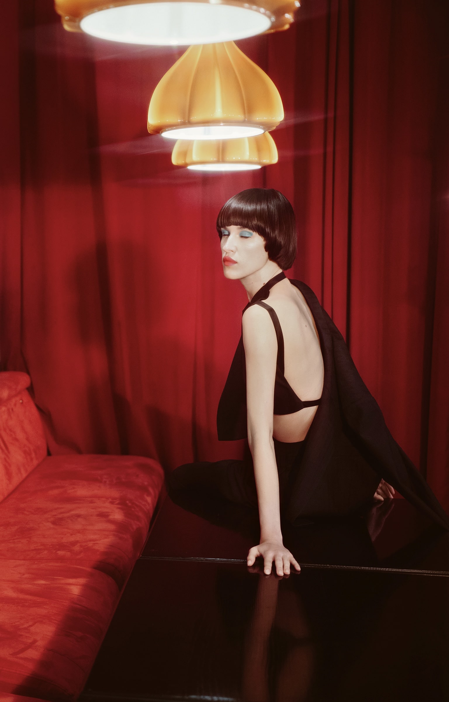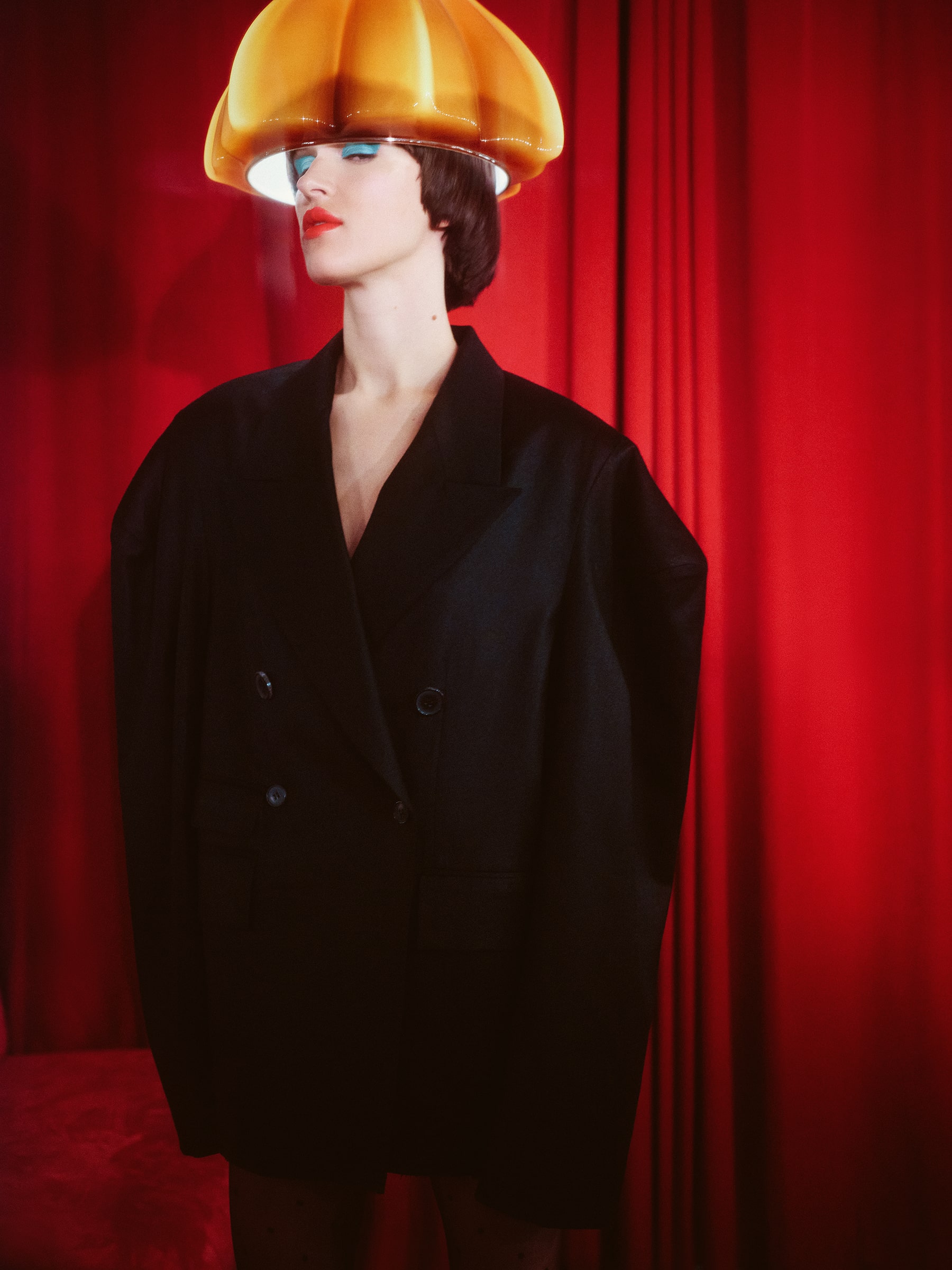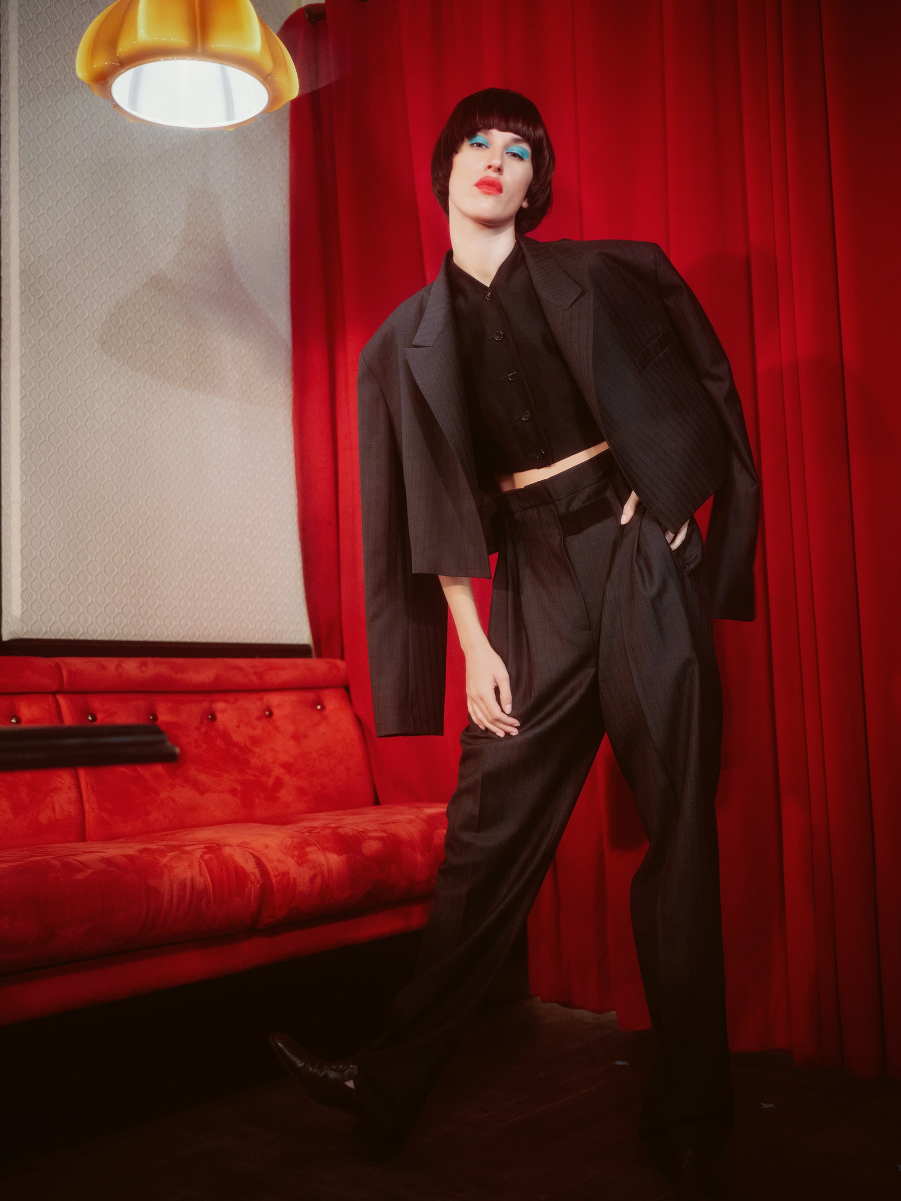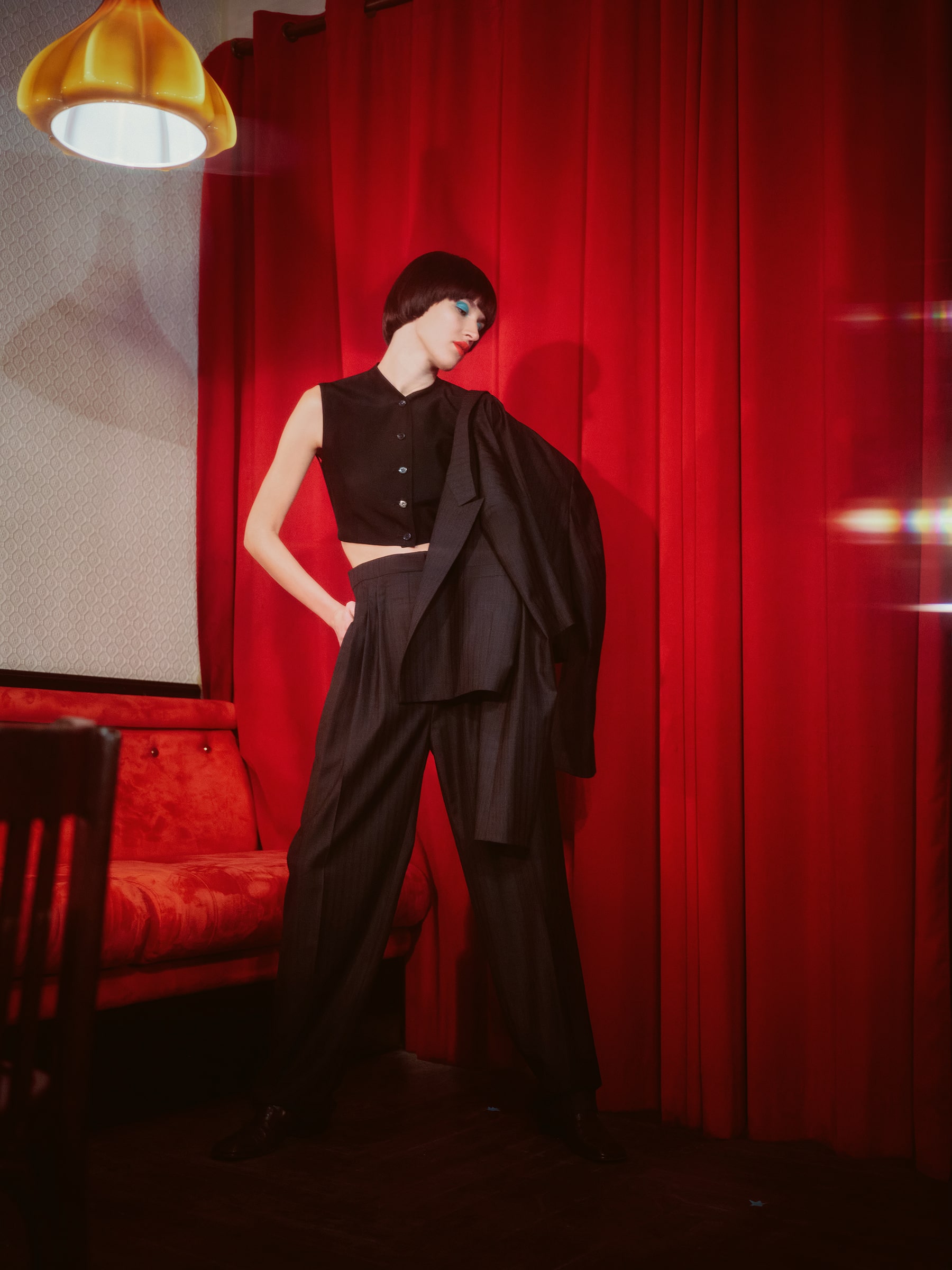 В капсулу вошли архитектурные черные топы, а также объемные и структурированные топы с открытыми плечами из белого и черного атласа, которые напоминают о платьях старого Голливуда, классические широкие брюки и маскулинные пиджаки.