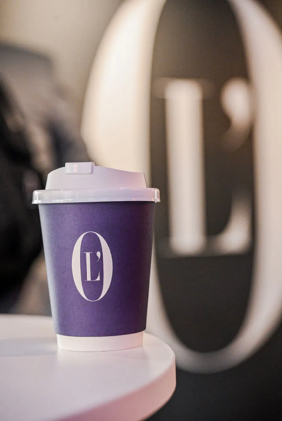 Логотип першої кав’ярні L`Officiel виконаний у трендовому синьому кольорі в мінімалістичному стилі. Ці ж відтінки відгукуються на паперових стаканчиках закладу, в який каву й улюблені напої можна взяти to go.
