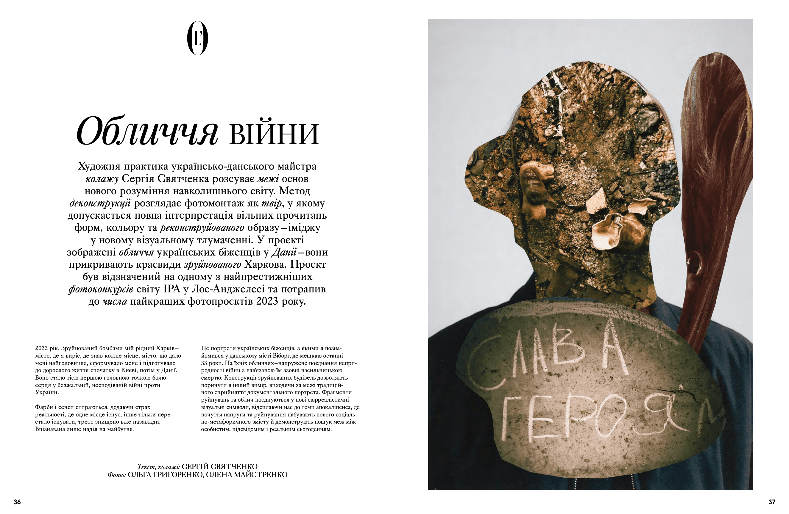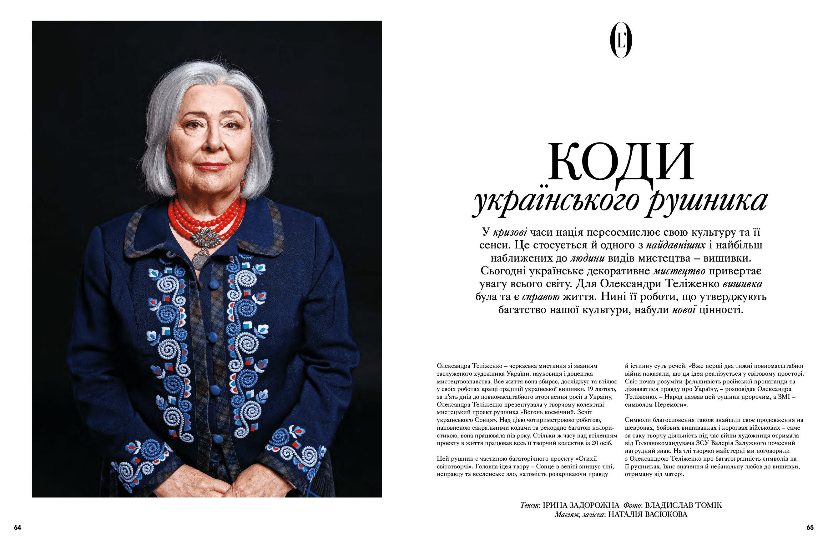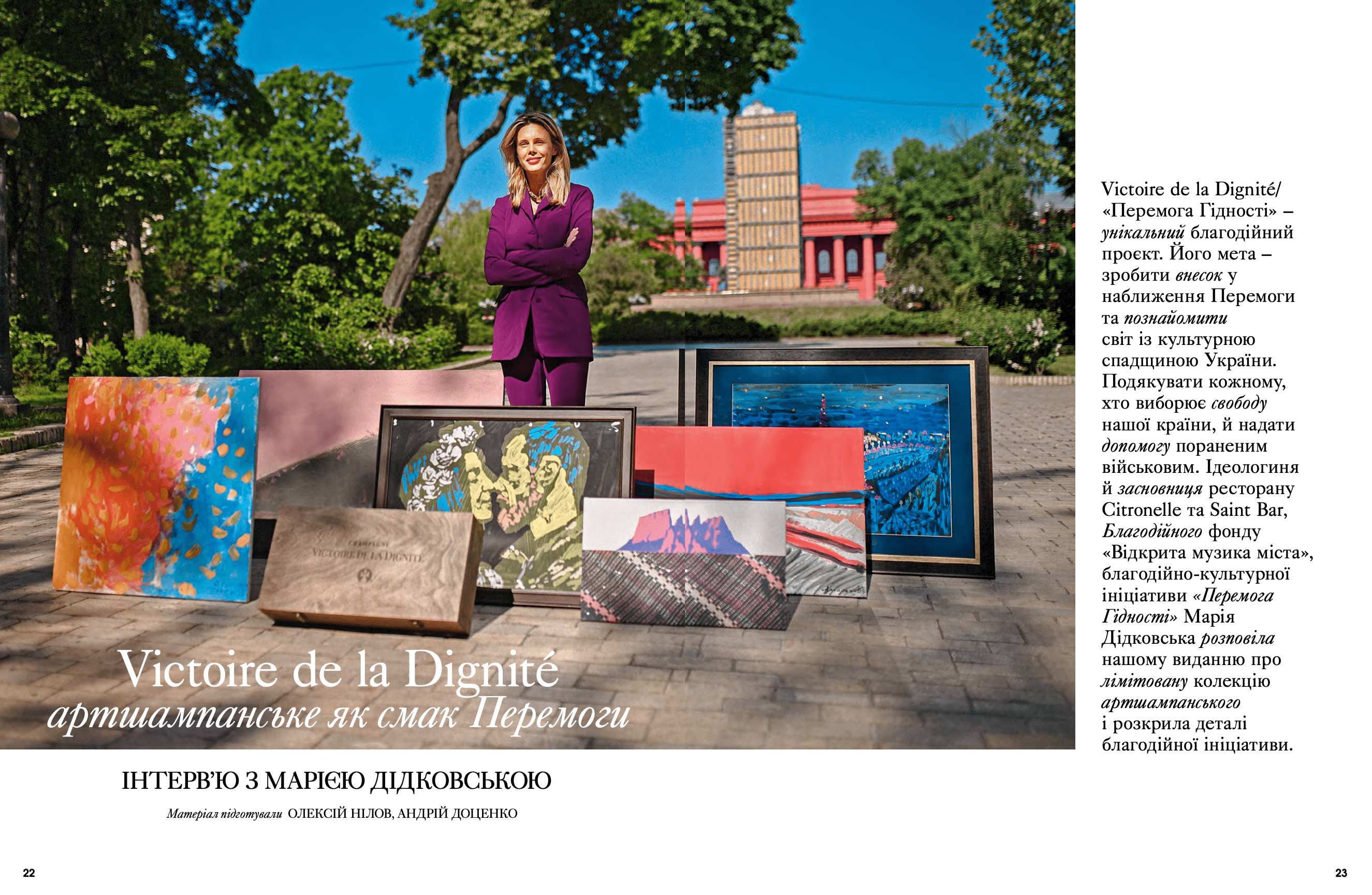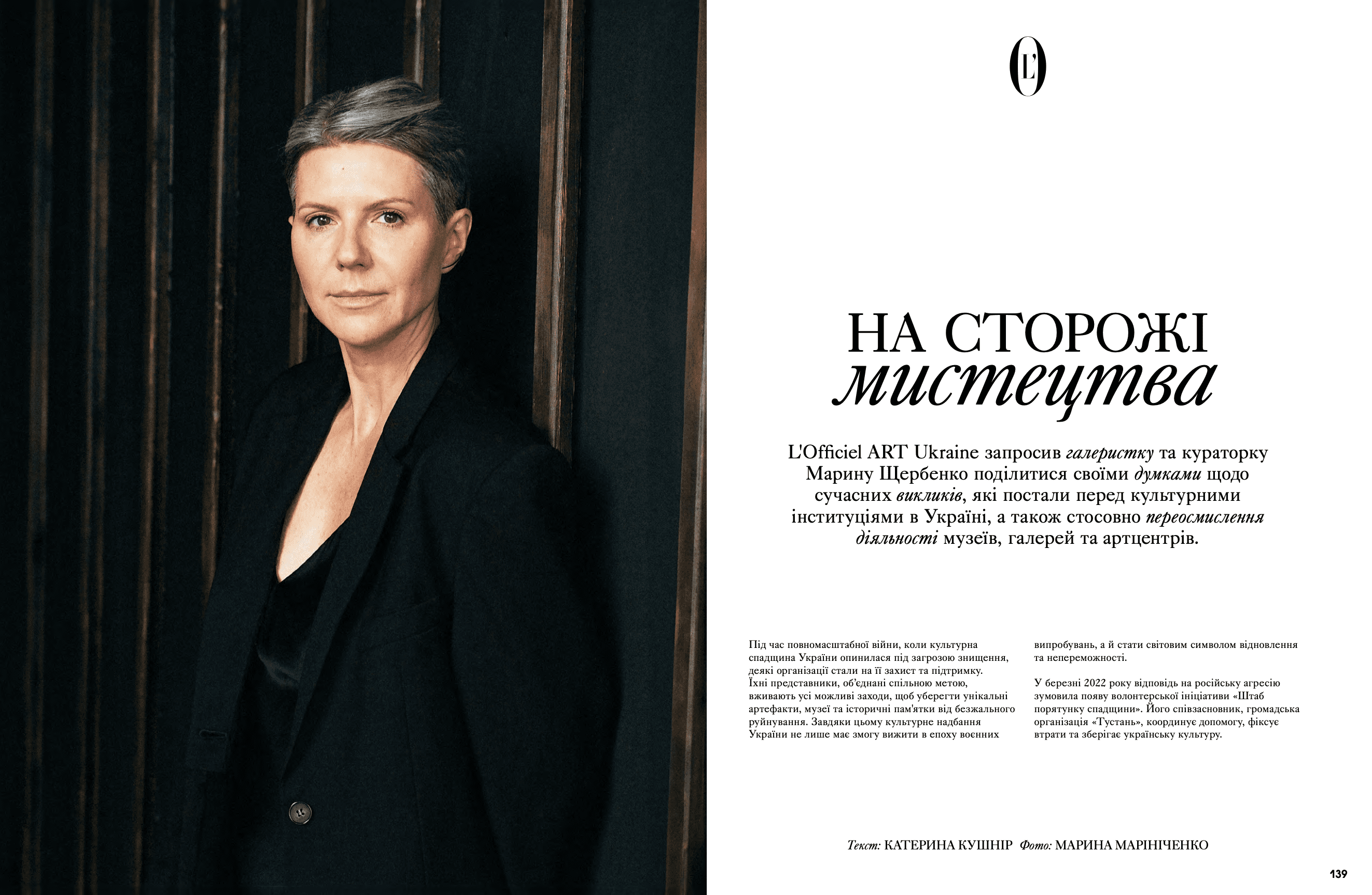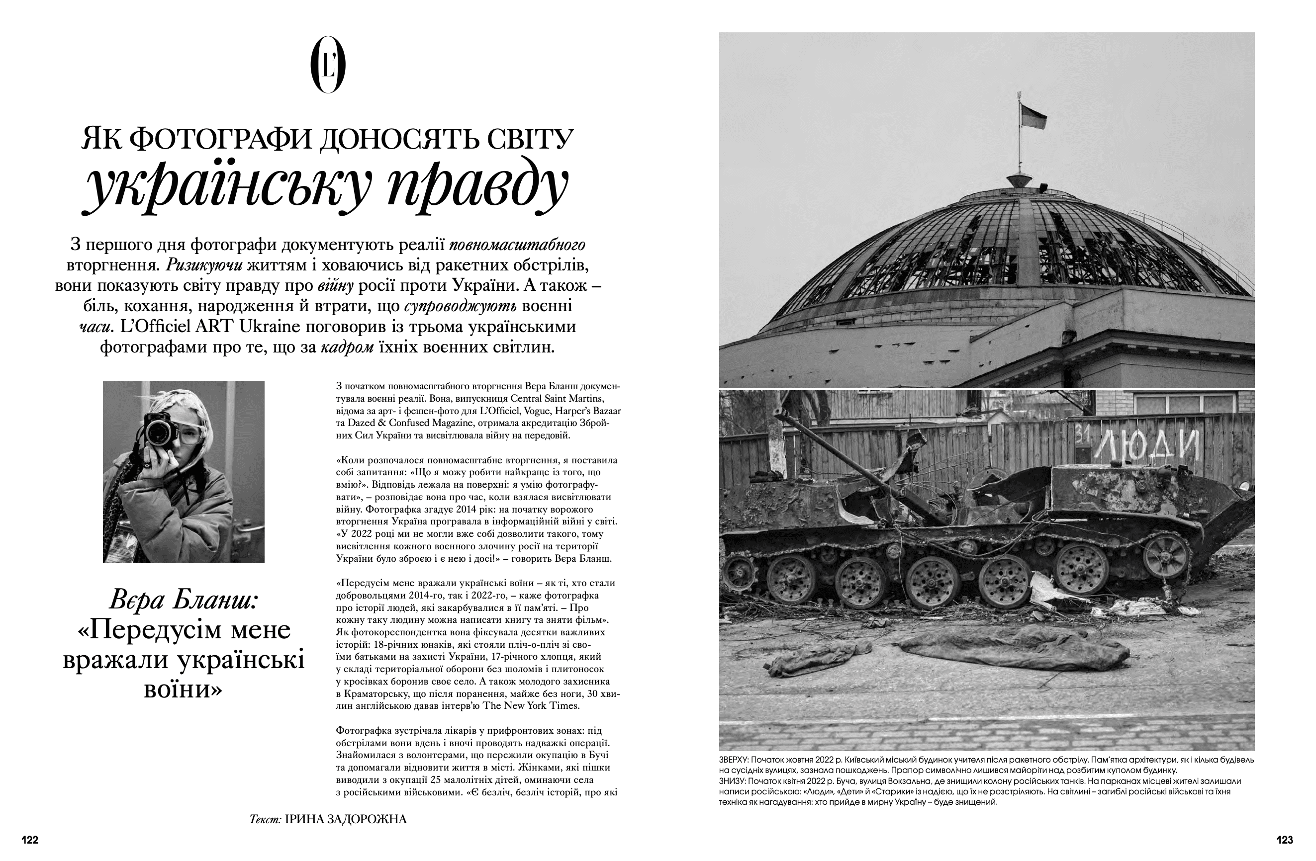 На сторінках видання з'явилися Дмитро Авдєєв, український кінорежисер, кінокритик та волонтер, Марія Дідковська з колекцією артшампанського Victoire de la Dignité, незмінний артдиректор «L’Оfficiel Україна» та L’Officiel Hommes Костянтин Аврамов з проєктом «Воїни світла», який він створює на фронті, Сергій Святченко з проєктом «Обличчя війни», колаж якого став обкладинкою артчисла (у проєкті зображені обличчя українських біженців у Данії – вони прикривають краєвиди зруйнованого Харкова). Мистецтвознавиця та співзасновниця Музею Харківської школи фотографії Надія Бернар-Ковальчук розповіла про етапи формування, розвитку та пошуку місця харківських фотографів у актуальному мистецтві; Україна в межах 60-ї Венеційської бієнале – тема мистецького діалогу Максима Горбацького та Вікторії Бавикіної. Віра Агеєва, професорка Києво-Могилянської академії, літературна критикиня, докторка філологічних наук, лауреатка Шевченківської премії, членкиня журі премії «Книга року ВВС» та співзасновниція Київського інституту гендерних досліджень, розповіла про український культурний спротив, поімперські наслідки й роздвоєність Гоголя. Олександра Теліженко розкрила коди українського рушника; для неї вишивка була та є справою життя. Нині її роботи, що утверджують багатство нашої культури, набули нової цінності. З Ольгою Пілюгіною ми поговорили про решетилівське килимарство, стародавній художній промисел, здавна поширений в Україні. Також ми запросили дослідницю мистецтва воєнного часу та фахівчиню з міжнародних переговорів Олесю Геращенко до обговорення українського культурного надбання, яке було викрадено, вивезено та пошкоджено. Жанна Кадирова розповіла про гуманітарну мету проєкту «Паляниця», закарпатські мистецькі досвіди та очікувану інсталяцію на Алтаї.