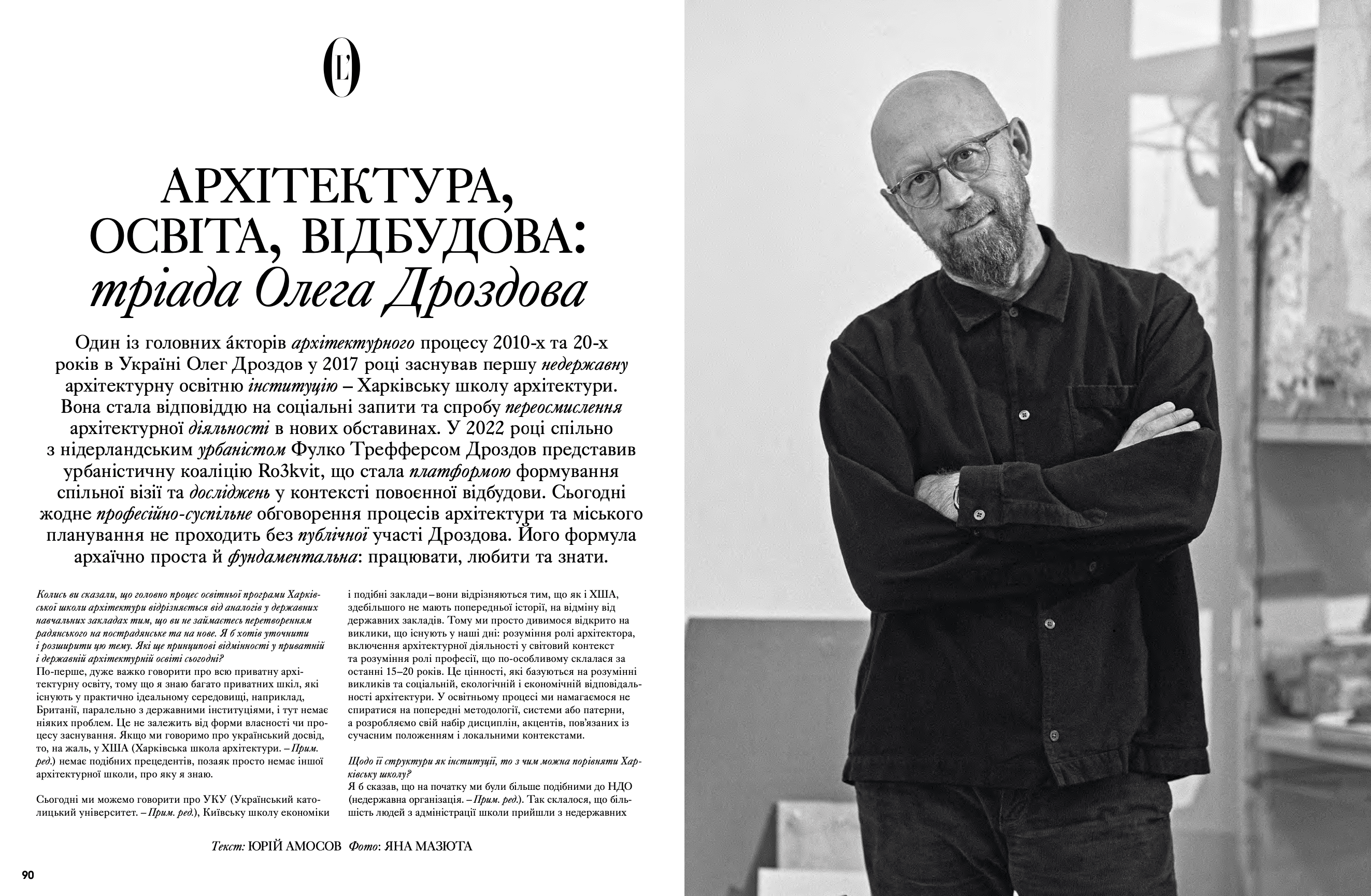 Один із головних авторів архітектурного процесу 2010-х та 20-х років в Україні Олег Дроздов у 2017 році заснував першу недержавну архітектурну освітню інституцію – Харківську школу архітектури. Сьогодні жодне професійно-суспільне обговорення процесів архітектури та міського планування не проходить без публічної участі Дроздова. Його формула післявоєнної відбудови архаїчно проста й фундаментальна: працювати, любити та знати.