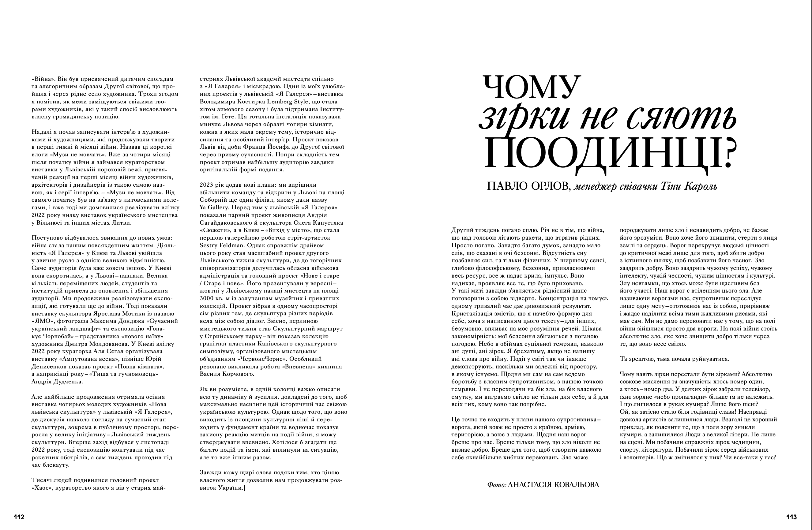 Запрошені колумністи рефлексували на різні теми: Павло Орлов про те, чому зірки більше не сяють поодинці, Олег Рижов – чи існує краса там, де немає себе, kartyna розповів про концерти для військових, а Павло Гудімов – про роботу арт-куратора під час війни, виклики, невпинну роботу й суспільний резонанс.
