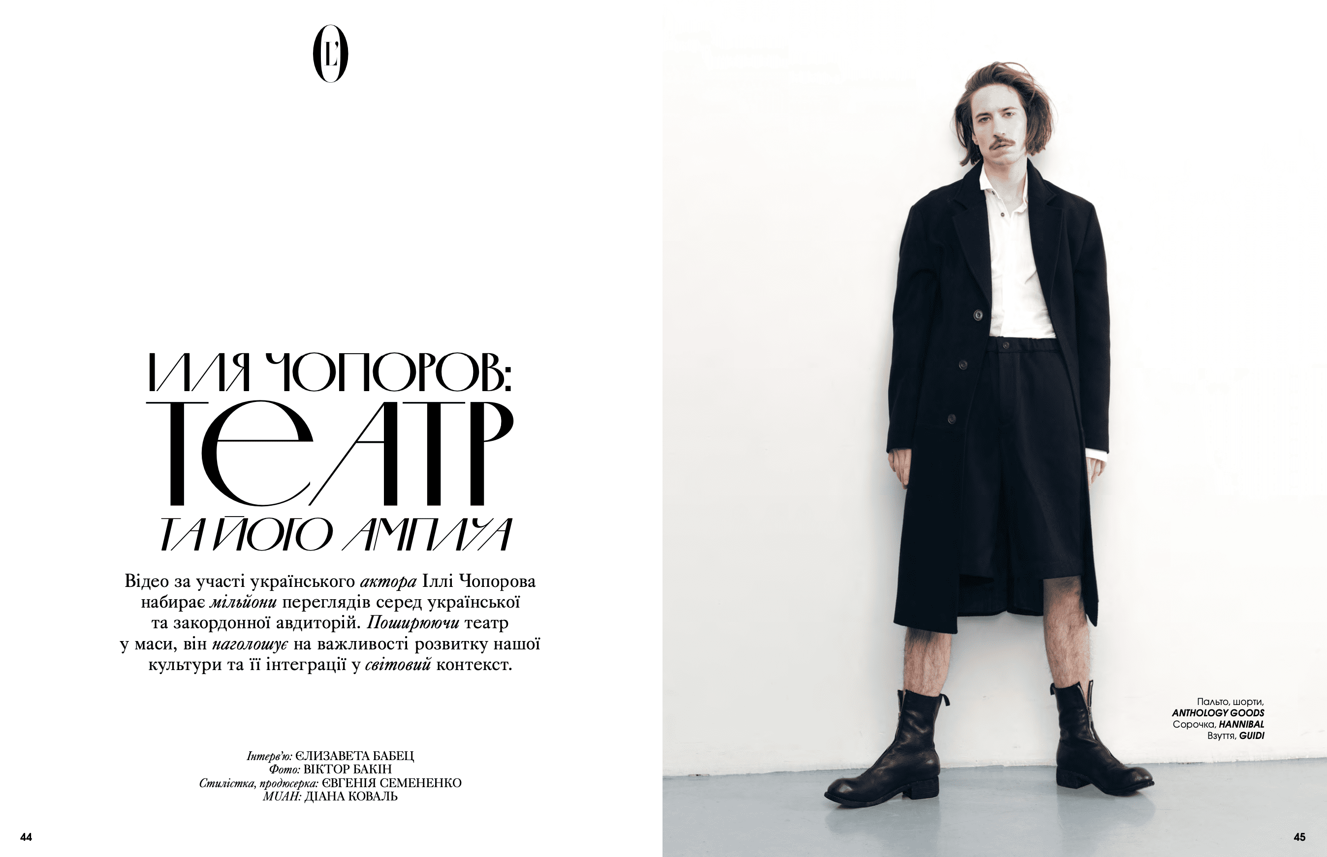 Відео за участі українського актора Іллі Чопорова набирає мільйони переглядів серед української та закордонної авдиторій. Поширюючи театр у маси, він наголошує на важливості розвитку нашої культури та її інтеграції у світовий контекст. В інтервʼю для друкованого числа «L’Officiel Україна» Ілля розповів про шалений успіх його героя «Кабаре»та плани на майбутнє.