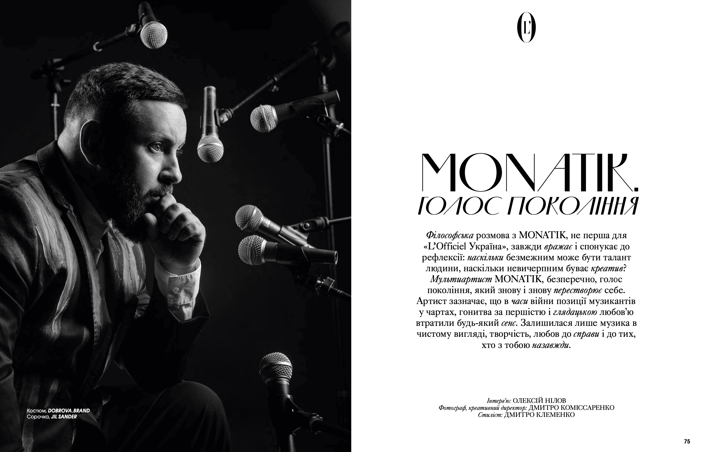 Головним героєм нового числа став головний артист української сцени — MONATIK, який вже вдруге зʼявляється на обкладинці друкованого числа «L’Officiel Україна». У щирій розмові Дмитро ділиться останніми новинами про життя, творчість, сім’ю та новий альбом, представши перед читачами в об’єктиві Діми Коміссаренка.
