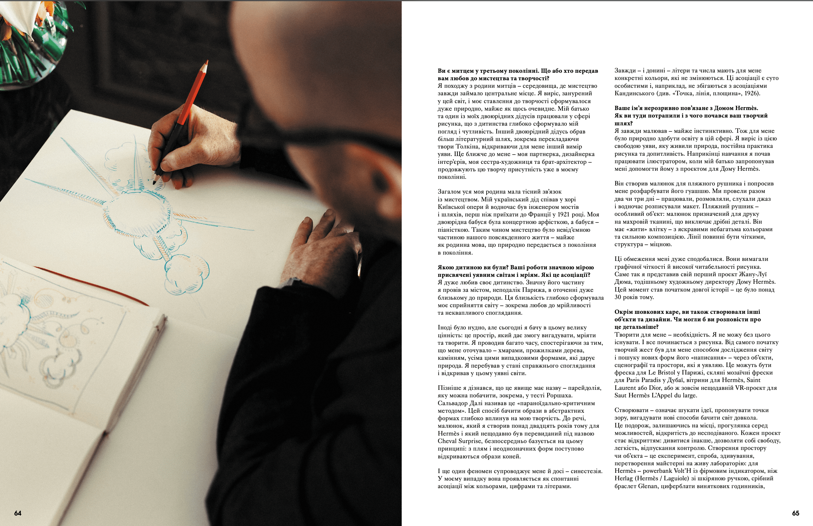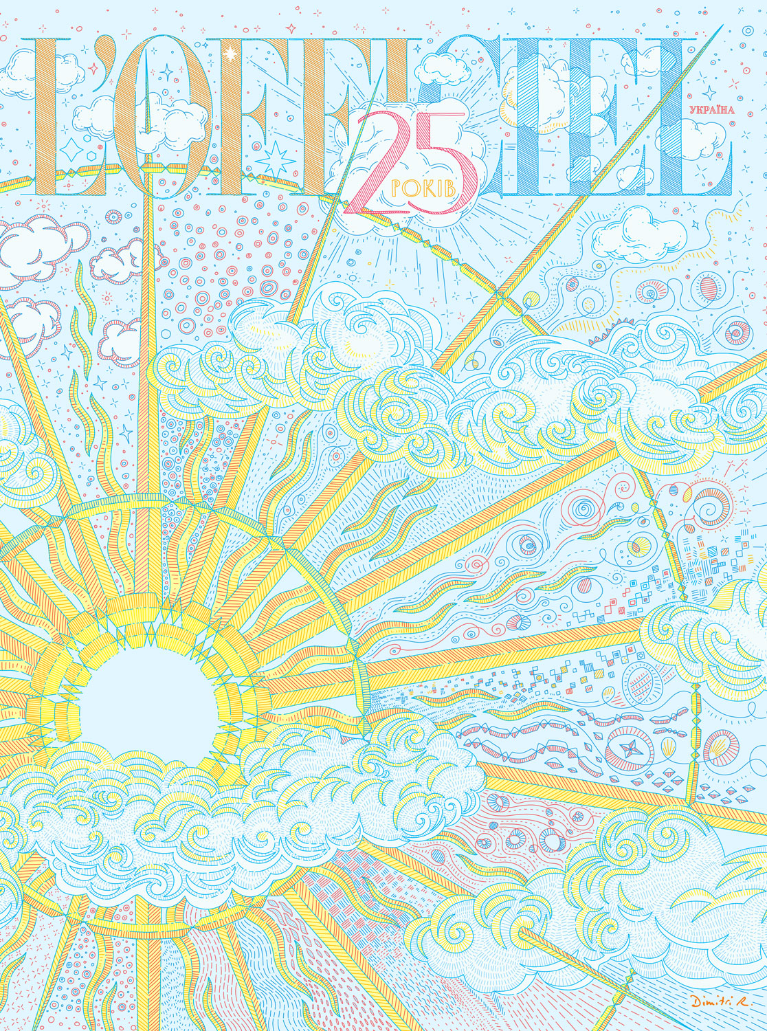 Артобкладинку до ювілейного колекційного числа створив Димитрієм Рибальченком — художник, для якого рисунок є не стільки технікою, скільки способом мислити й відчувати світ. Його роботи існують на перетині ремесла та уяви, де кожен образ народжується з тонкого діалогу між лінією, матеріалом і внутрішнім станом. Упродовж понад трьох десятиліть він створює цілі всесвіти — від шовкових каре Hermès до просторів, сценографій і об’єктів, залишаючись вірним одній ідеї: мистецтво як форма розповіді.