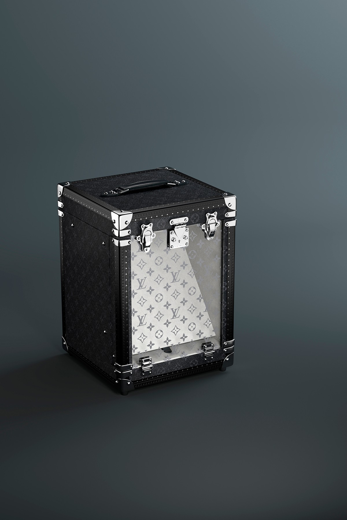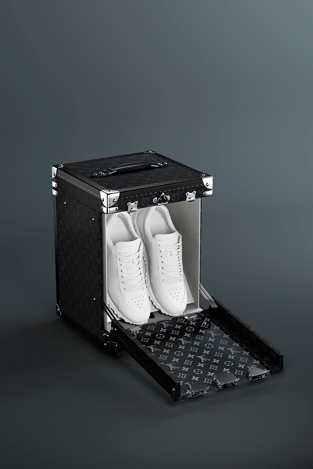 Дизайн выдержан в классическом стиле Louis Vuitton, с фирменным узором LV Monogram Eclipse, а форма коробки выполнена так, что её можно сложить как вертикально, так и горизонтально. Таким образом, бокс позволяет вмещать обувь любых размеров и фасонов. Также в коробке есть несколько скрытых отделений для мелких аксессуаров.