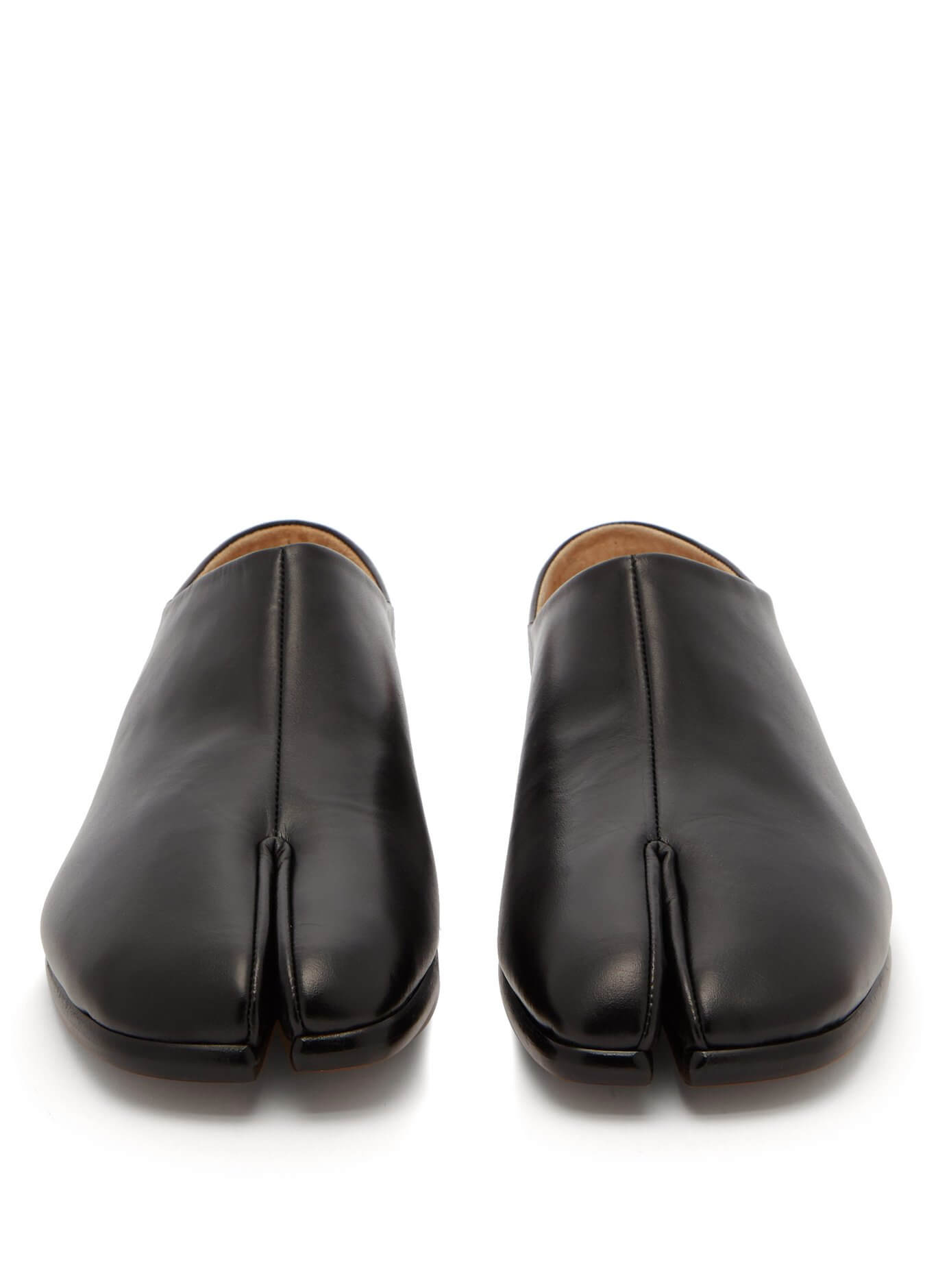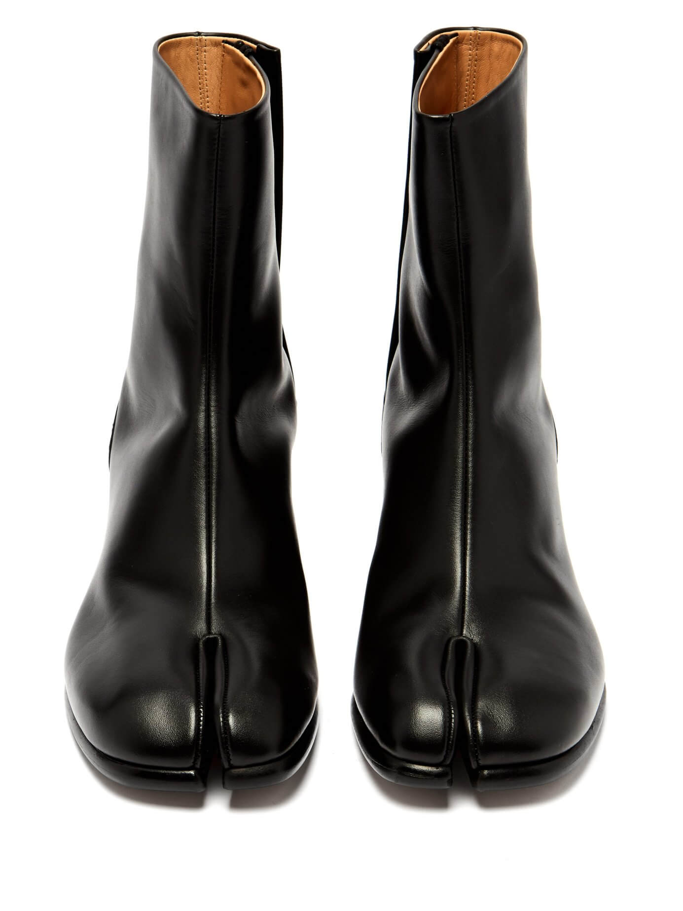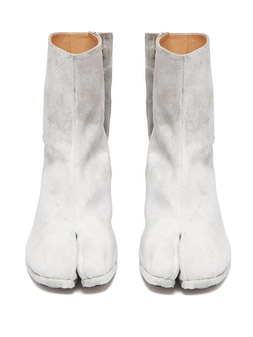 Оригинальные ботинки таби, вдохновленные традиционными японскими носками, Мартин Маржела впервые показал в 1988 году. В новой коллекции они появляются в классической черной коже и белой выкрашенной замше с круглым каблуком.