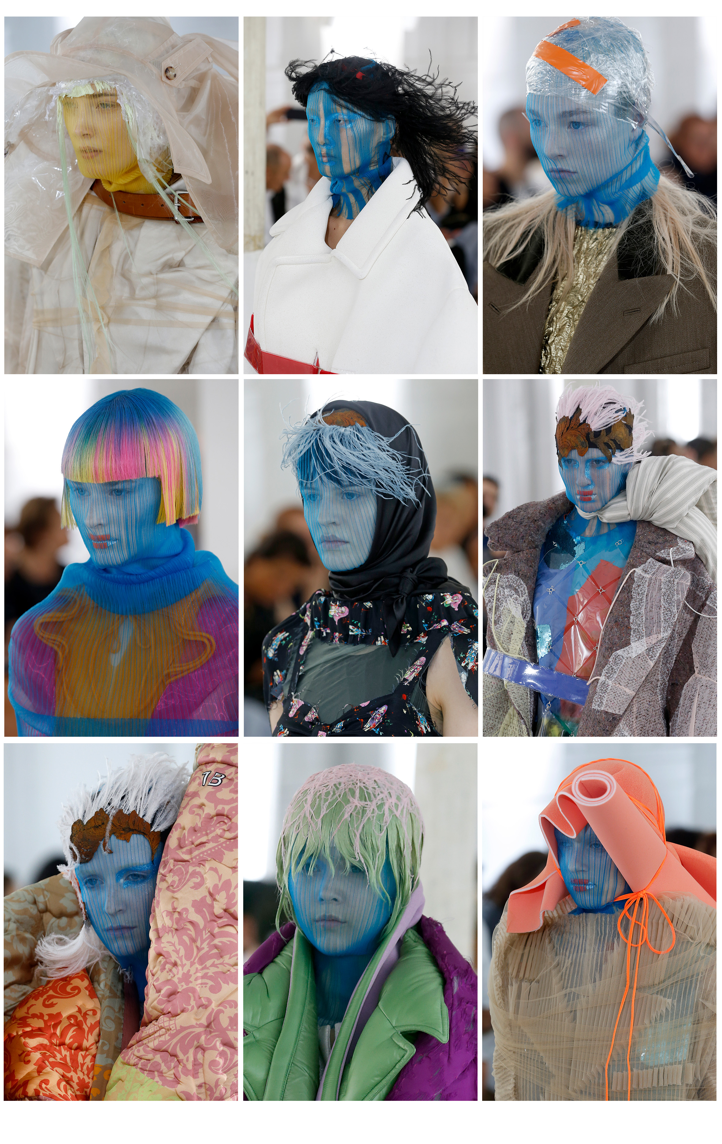 Рассматривая детали коллекции, – а на это вам понадобится даже не один час, если вы хотите увидеть все, – мы не смогли проигнорировать тончайшие разноцветные сети, которыми дизайнер опутал моделей и их лица, сделав их похожими на иноземных жителей. Разумеется, этот аксессуар – не на каждый день, да и по особому поводу мало кто сможет позволить себе его примерить, но нам все равно нравится. Помните, как несколько сезонов назад в обиход вошли балаклавы, когда дизайнеры массово задумались о внешних угрозах и ощущении опасности? Так вот, эта сетка похожа на летний ее вариант. А главное – ее можно носить со всем: с капюшоном, накладными цветными прядками, пластиковыми шапочками и горнолыжными очками – в общем, со всеми базовыми аксессуарами, которые наверняка есть на полочке у каждой.