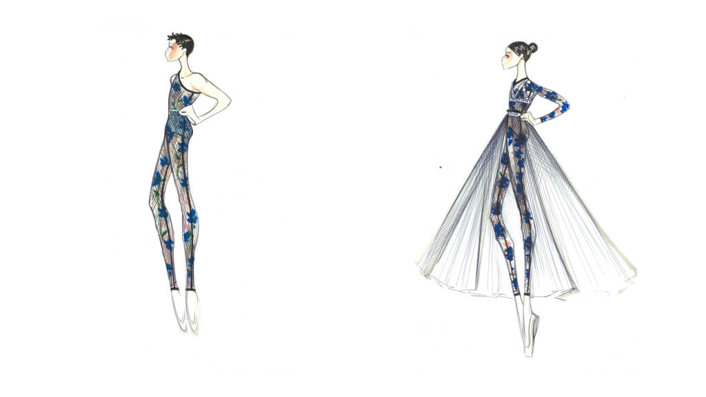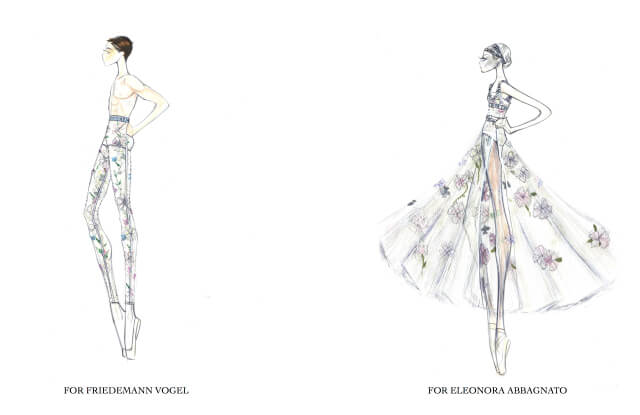 Креативный директор дома Dior создала 16 костюмов для кордебалета и еще два для солистов. Трикотаж и юбки из тюля надеты поверх обтягивающих костюмов, а юбка Аббаньято расшита шелковыми цветами, отсылающими к наследию Кристиана Диора. Аббаньято и Фогель будут танцевать в жемчуге в сочетании с яркими цветами, а кордебалет наденет боди бежевых тонов и черные юбки из тюля для контраста.