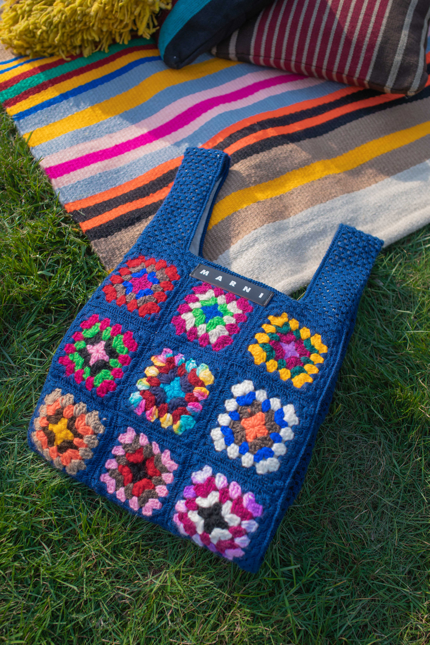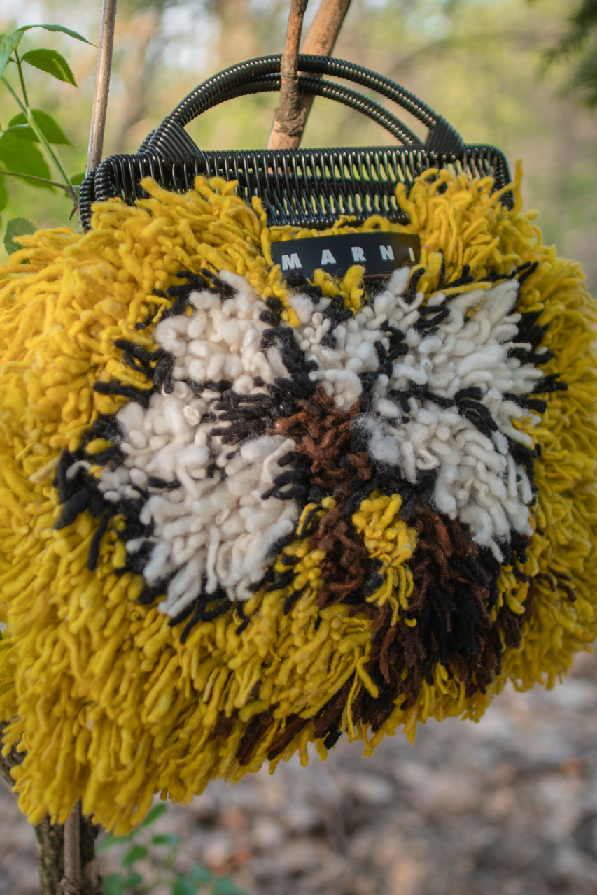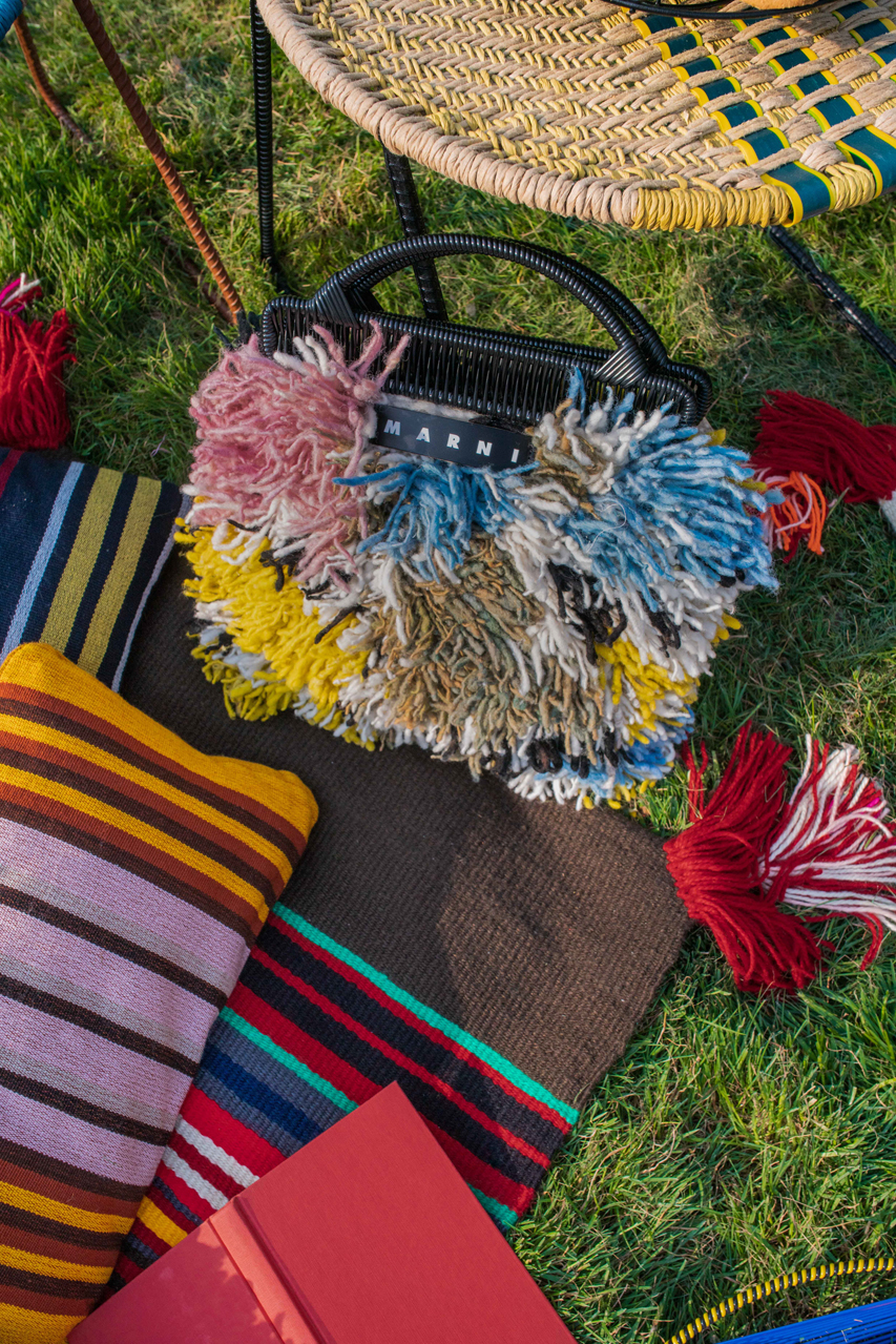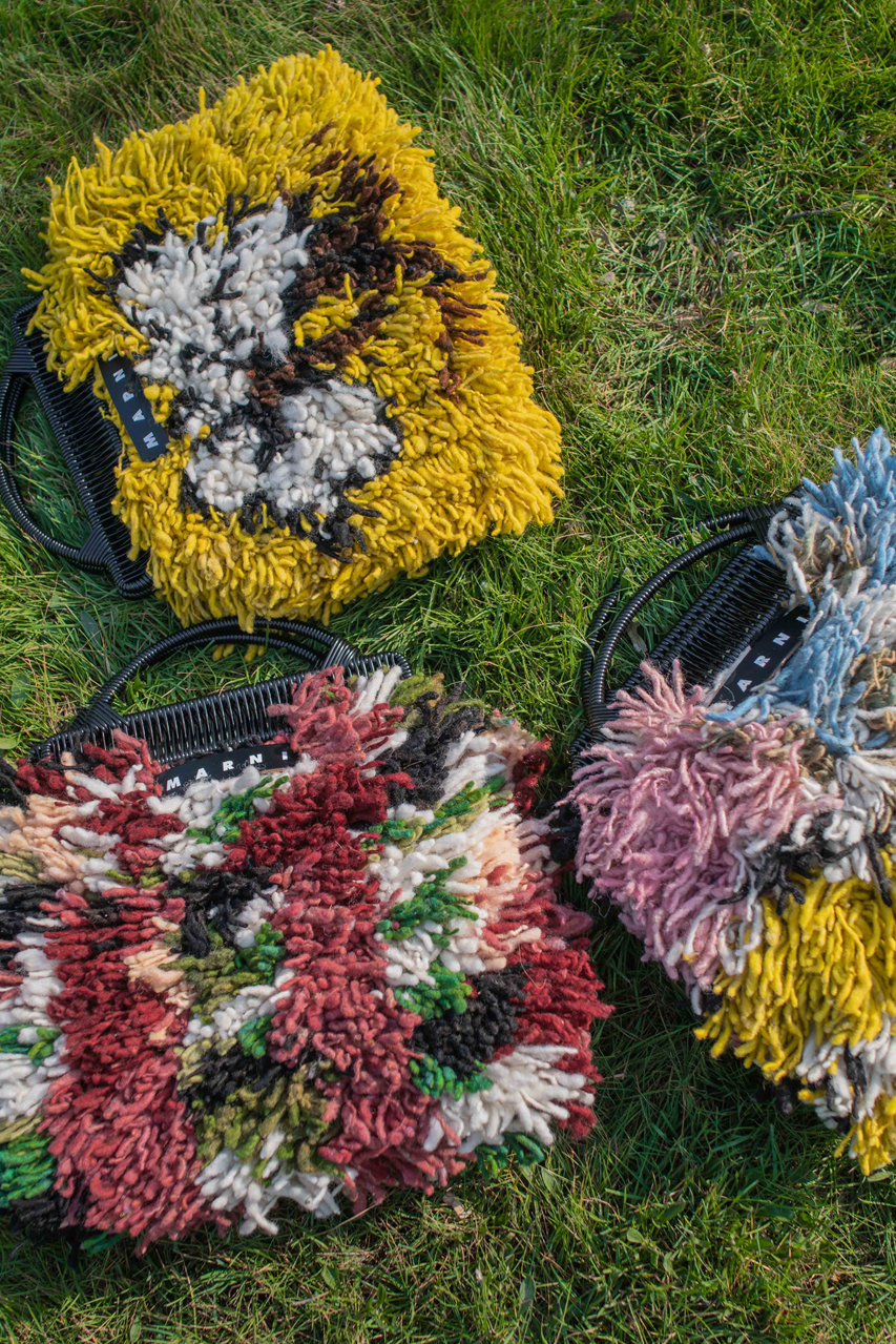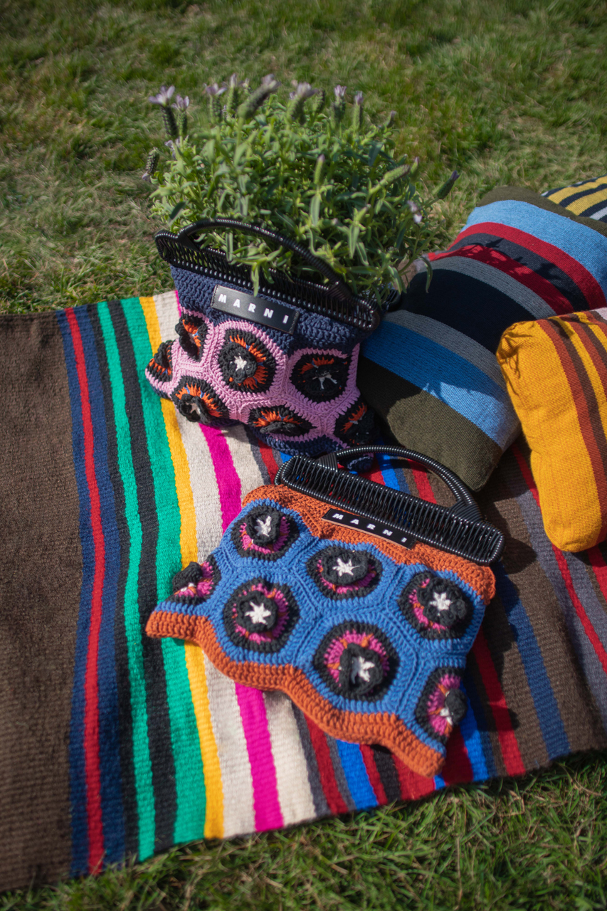 Все предметы созданы в ретроэстетике. Например, мягкие шерстяные сумки связаны крючком. Каждое изделие уникально, поскольку они сделаны колумбийскими мастерами, которые годами сотрудничают с Marni.