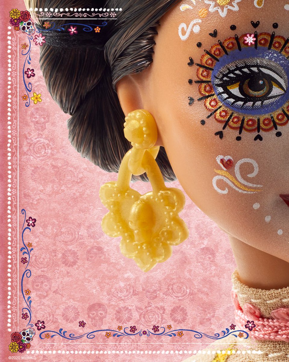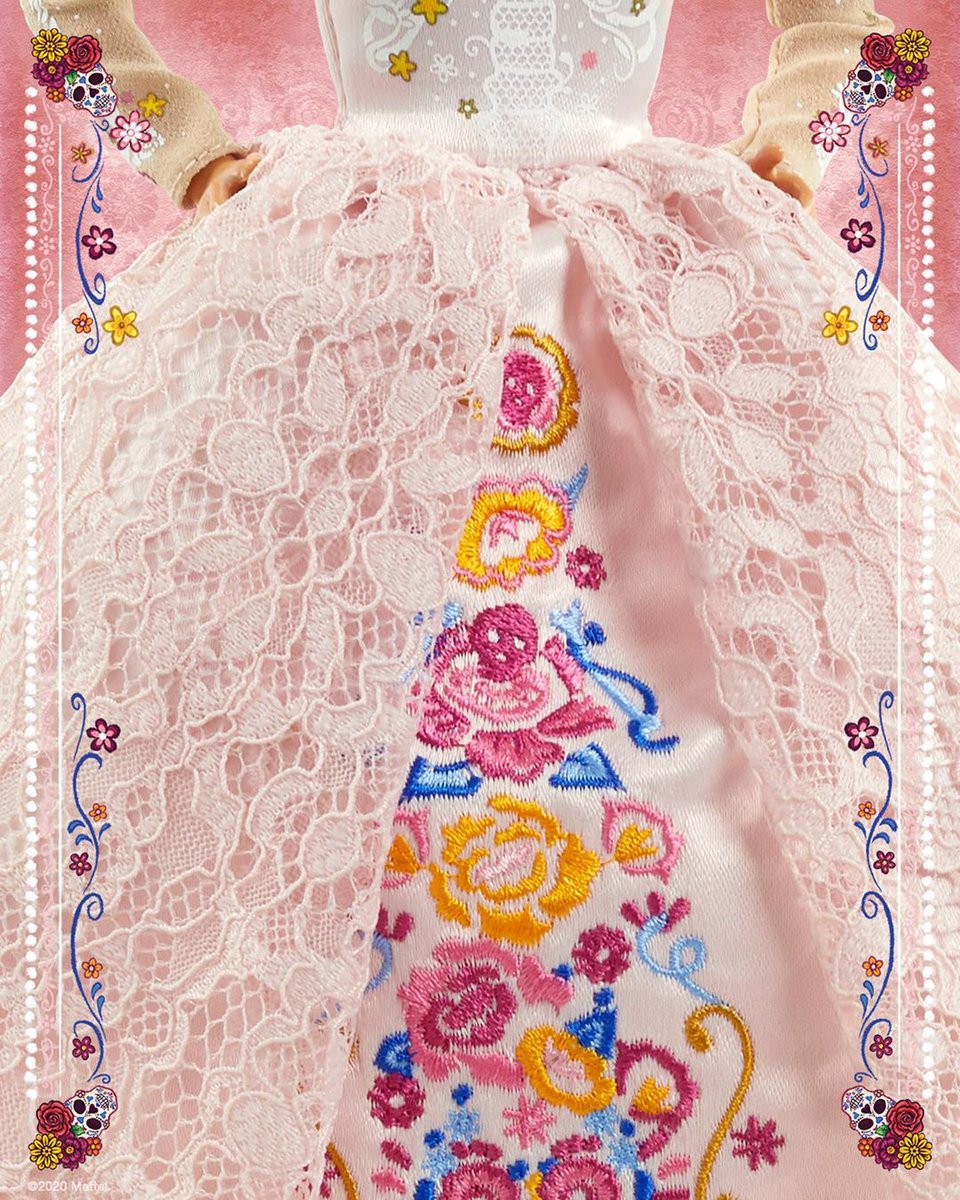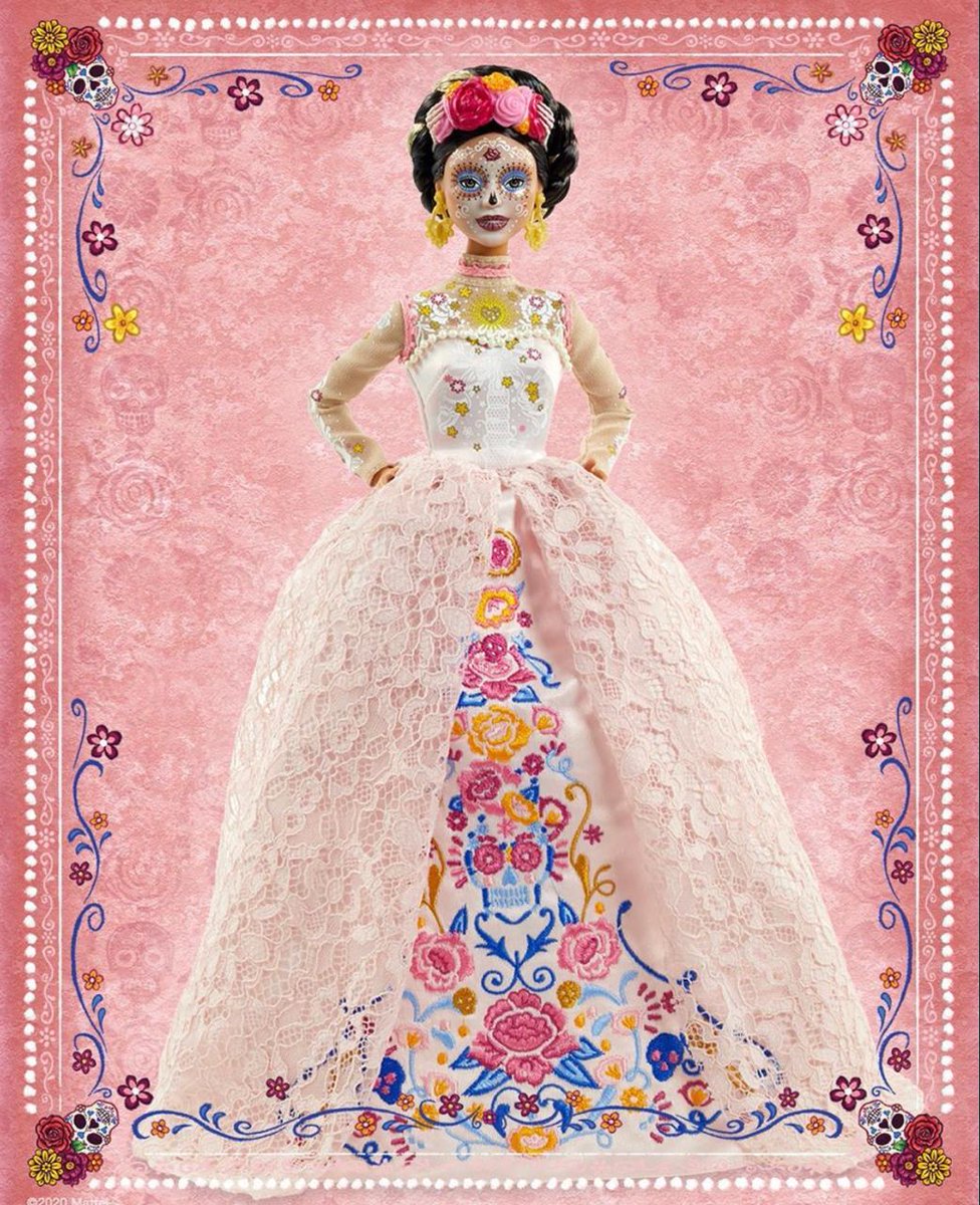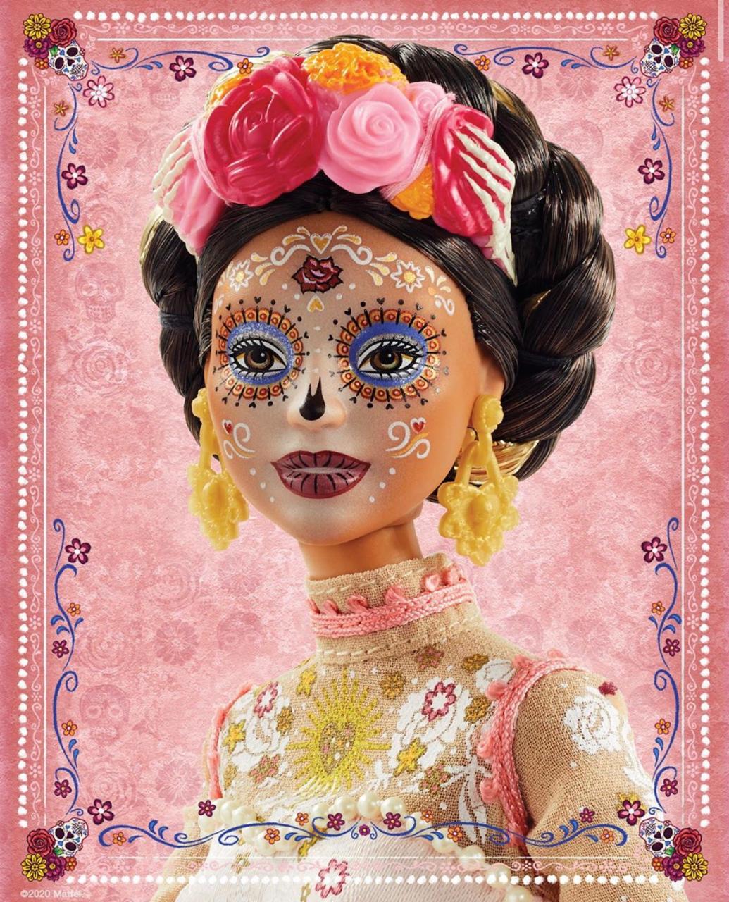 Лицо куклы раскрашено в стиле calavera (в переводе с испанского означает “череп”). Наряд Барби представляет собой кружевное традиционное мексиканское платье, украшенное цветами.