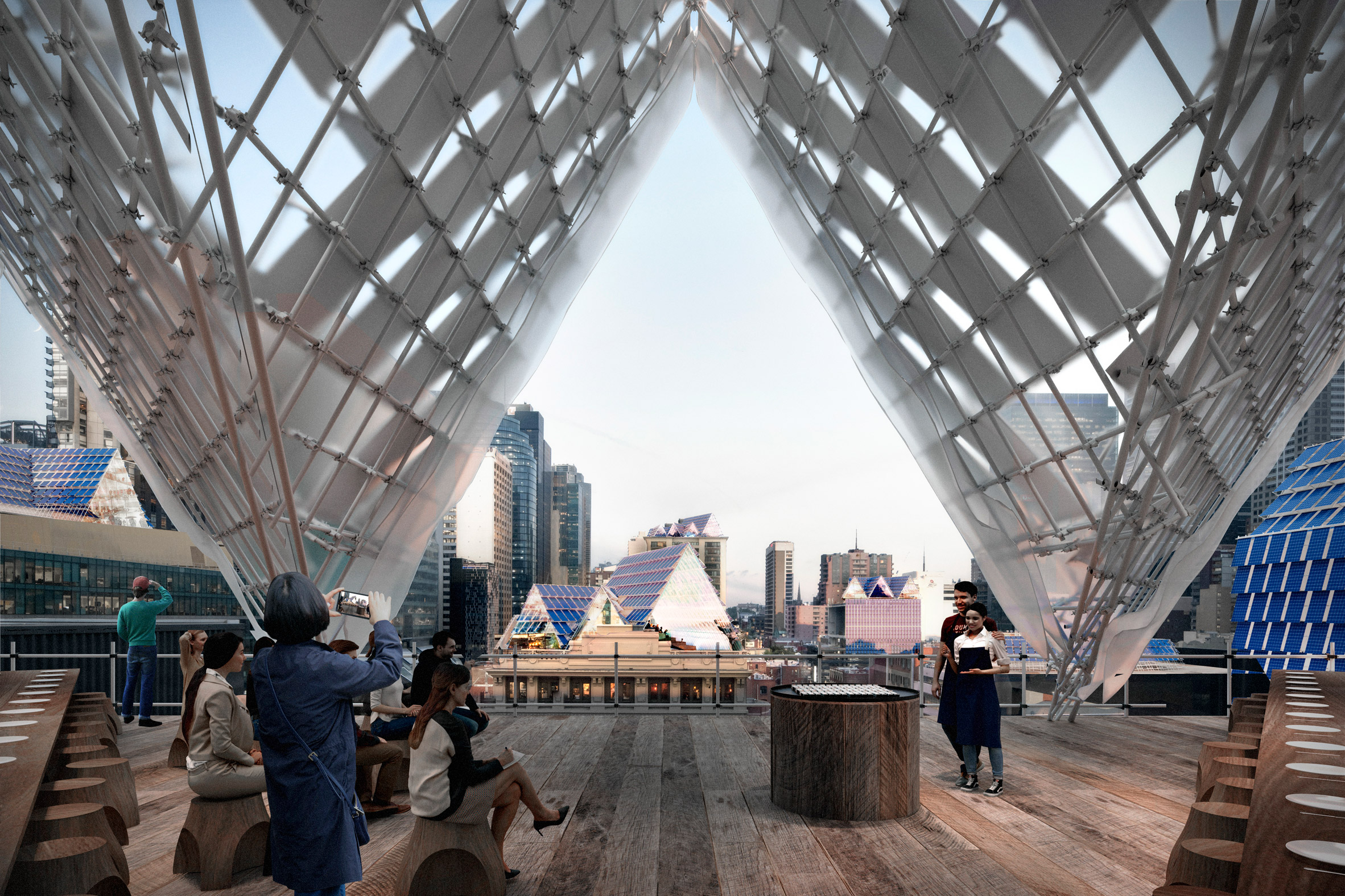 На крыши городских домов дизайнеры студии John Wardle Architects предложили установить навесы, изготовленные из фотоэлектрических систем, которые будут производить солнечную энергию. Крыши также можно будет использовать как коворкинги для работы и учебы, как баскетбольные площадки, а также для садовничества.