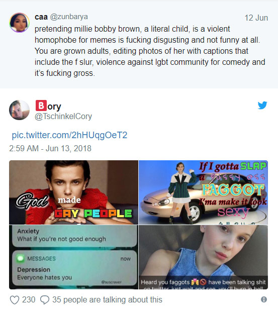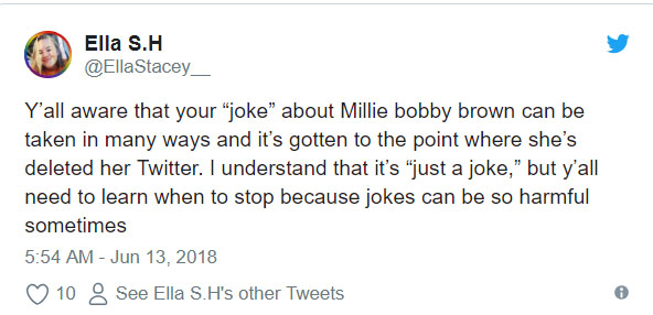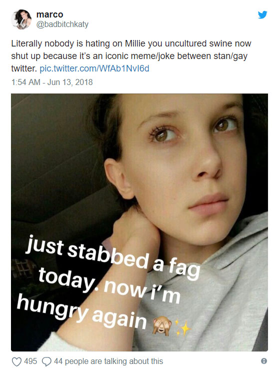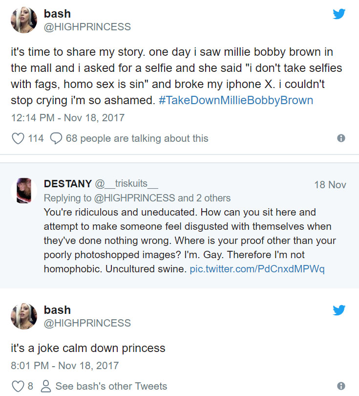 Через час после того, как Милли покинула твиттер, она запостила в инстаграме селфи с подписью Good vibes only («Только позитивный настрой»). Браун не стала говорить о том, как она оказалась в центре гомофобного скандала, толчком для которого стала история, опубликованная в ноябре прошлого года пользовательницей твиттера под ником @HlGHPRlNCESS. Она рассказала о том, как якобы встретила актрису в торговом центре и захотела с ней сфотографироваться и та не только отказала ей из-за того, что девушка является лесбиянкой, но и разбила ее телефон. Позже, конечно же, выяснилось, что вся история оказалась выдумкой, но с этого момента другие пользователи твиттера подхватили «флешмоб» и начали не только публиковать подобные рассказы о Милли, но и создавать мемы из ее фотографий и гомофобных подписей.