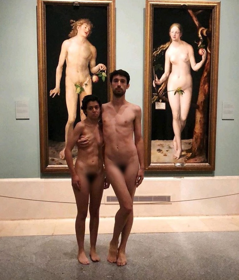 Обнажаясь в музее Прадо перед панелями “Адам” и “Ева” Альбрехта Дюрера, Адриан Пино Оливера вместе со своей подругой хотел показать, что “концепция мужчины и женщины, установленная в Библии на примере Адама и Евы, очень устарела”. По словам концептуалиста, пол – это лишь толкование, так что мужчина может чувствовать себя женщиной и наоборот. Эту идею он подчеркнул, посвятив свою акцию Еве, – именно ее фигуру он намеревался воплотить, спрятав свои мужские гениталии. А напарницей Адриана стала его лучший друг Джет Брюль, которую сам художник представил как недвоично идентифицирующего себя человека. Почти сразу после того, как пара обнажилась в Прадо, охранник попросил их одеться и вызвал полицию, которая оштрафовала их на 50 евро. На уголовном преследовании художников учреждение настаивать не будет.