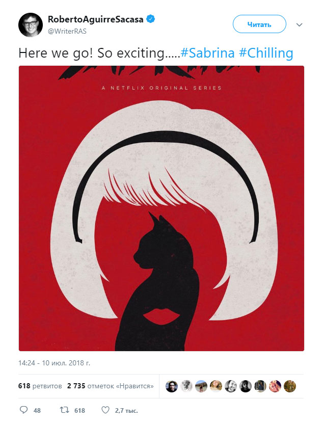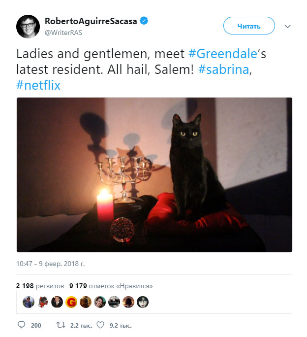 Известно, что производство “Сабрины” началось в феврале этого года и главную роль в ней исполняет звезда сериала “Безумцы” Кирнан Шипка. Конечно же, в новом проекте не обойдется и без кота Салема — его фотографию мы также могли увидеть в твиттере Агирре-Сакасы.