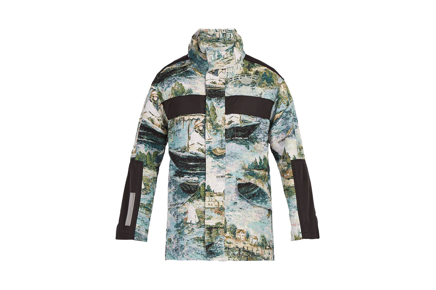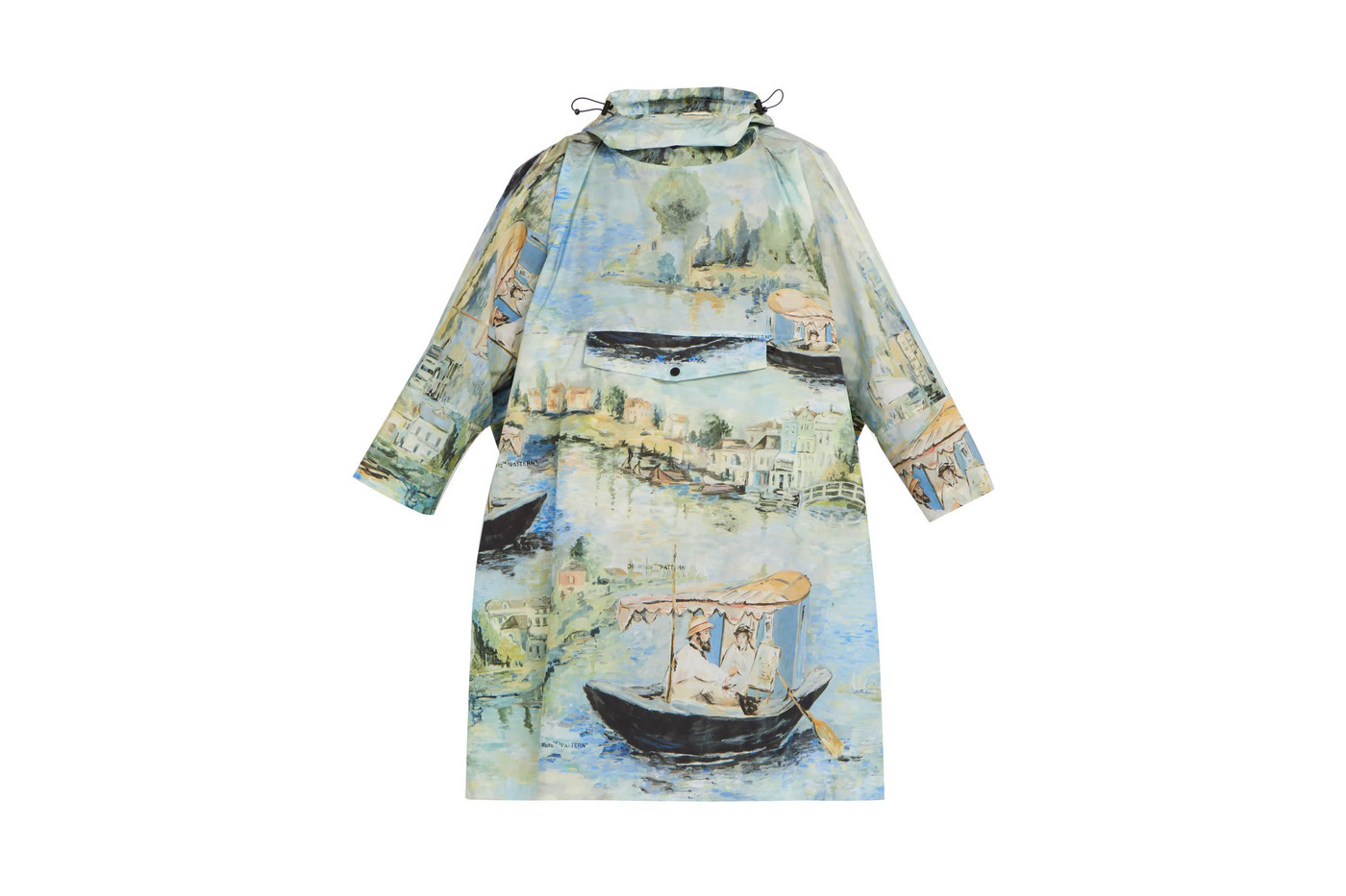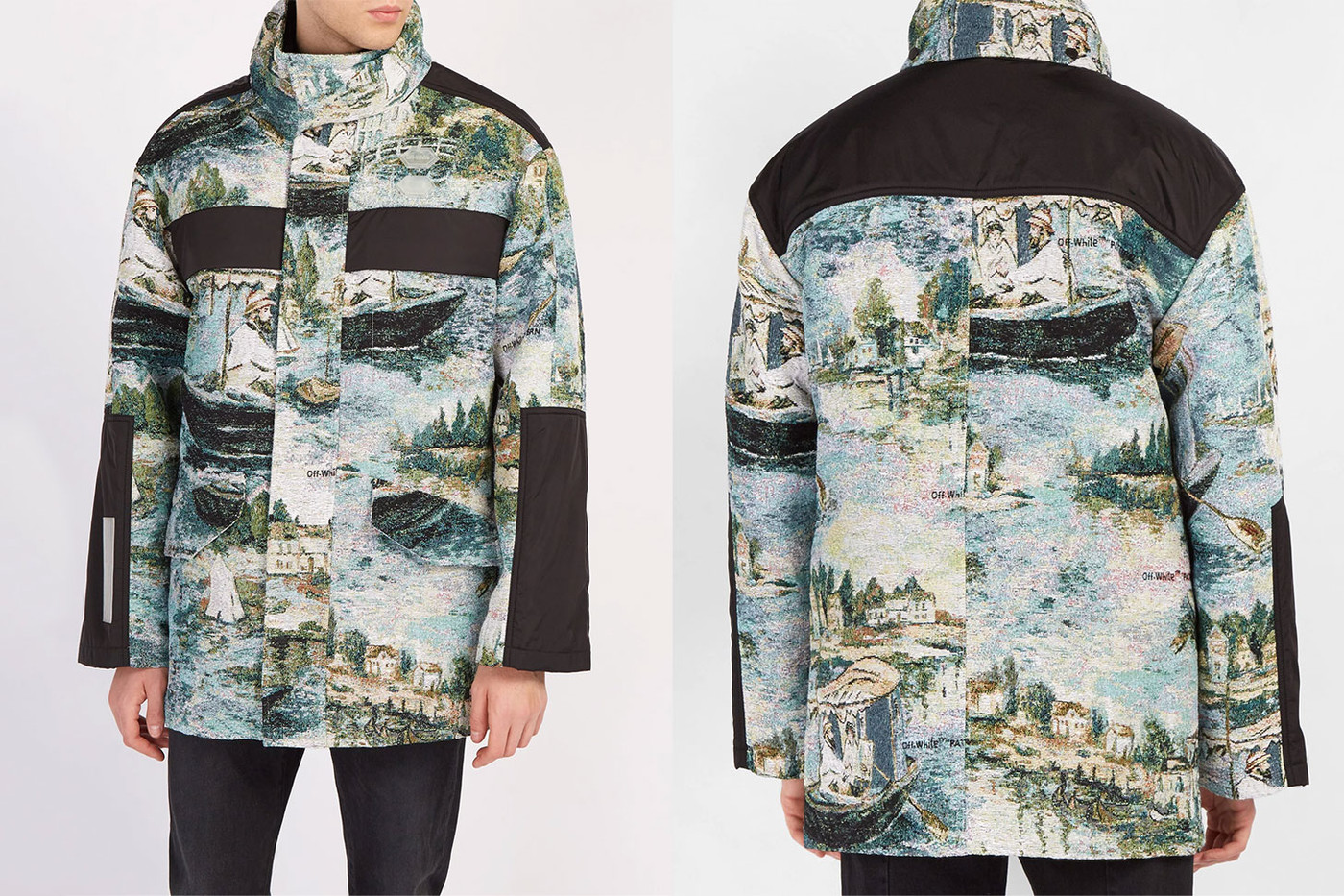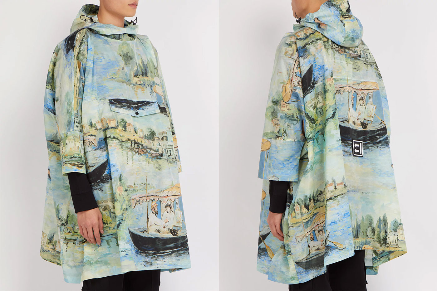 Off-White выпустили серию верхней одежды с картиной Эдуарда Мане “Клод Моне в своей лодке-студии”. На полотне 1874 года изображен импрессионист Клод Моне, работающий прямо в своей лодке во время совместной поездки художников в Аржантей. Куртка и пончо с повторяющимися фрагментами картины сшиты из водонепроницаемого нейлона. Модели стали частью круизной коллекции бренда. Вещи уже можно купить на Matchesfashion.com. Стоимость парки — 1142 фунта.
