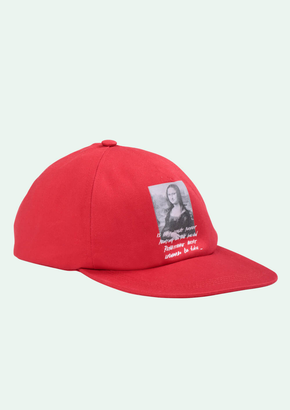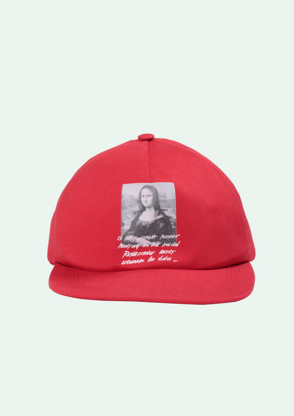 Вирджил Абло продолжает исследовать европейское искусство: осенью он выпустил капсульную коллекцию с принтами работ импрессионистов, а теперь отдает дань уважения великому итальянскому мастеру Леонардо да Винчи. Он поместил изображение главной работы эпохи Ренессанса — портрет Моны Лизы — на красную кепку. Под черно-белой картиной на передней части значится описание шрифтом от руки.