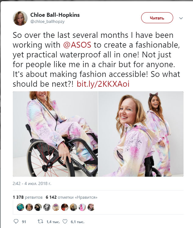 ASOS объединились с репортером ВВС и параатлетом Хлоей Болл-Хопкинс для того, чтобы создать комбинезон, который удобно было бы носить людям с инвалидностью. Спойлер: он вышел очень милым и ярким. Об этом сообщает The Cut.