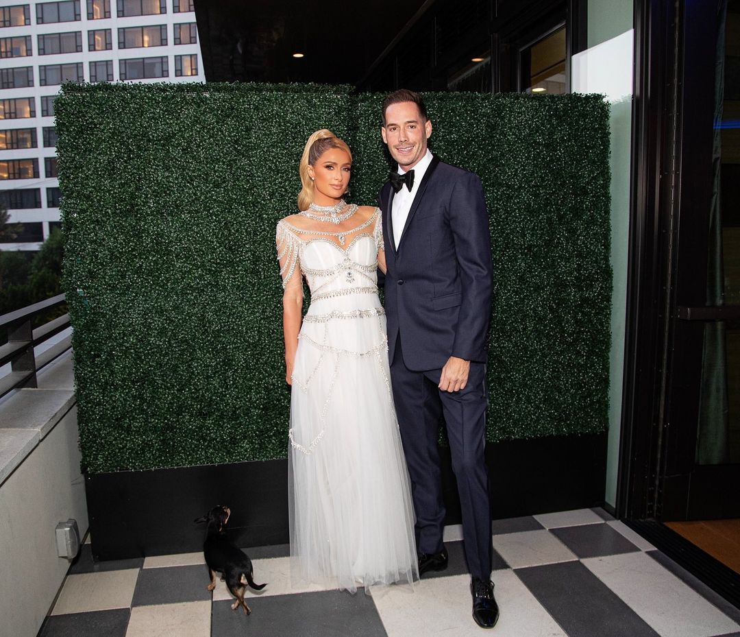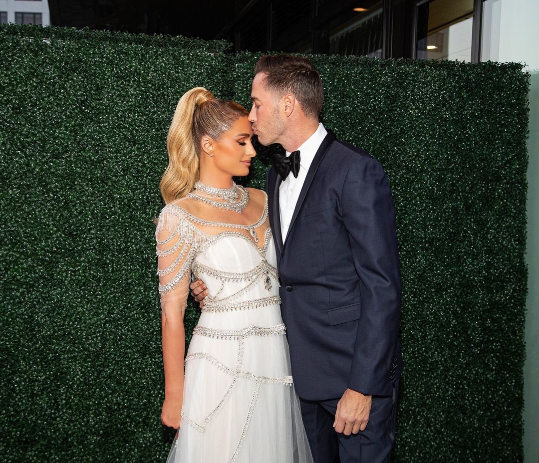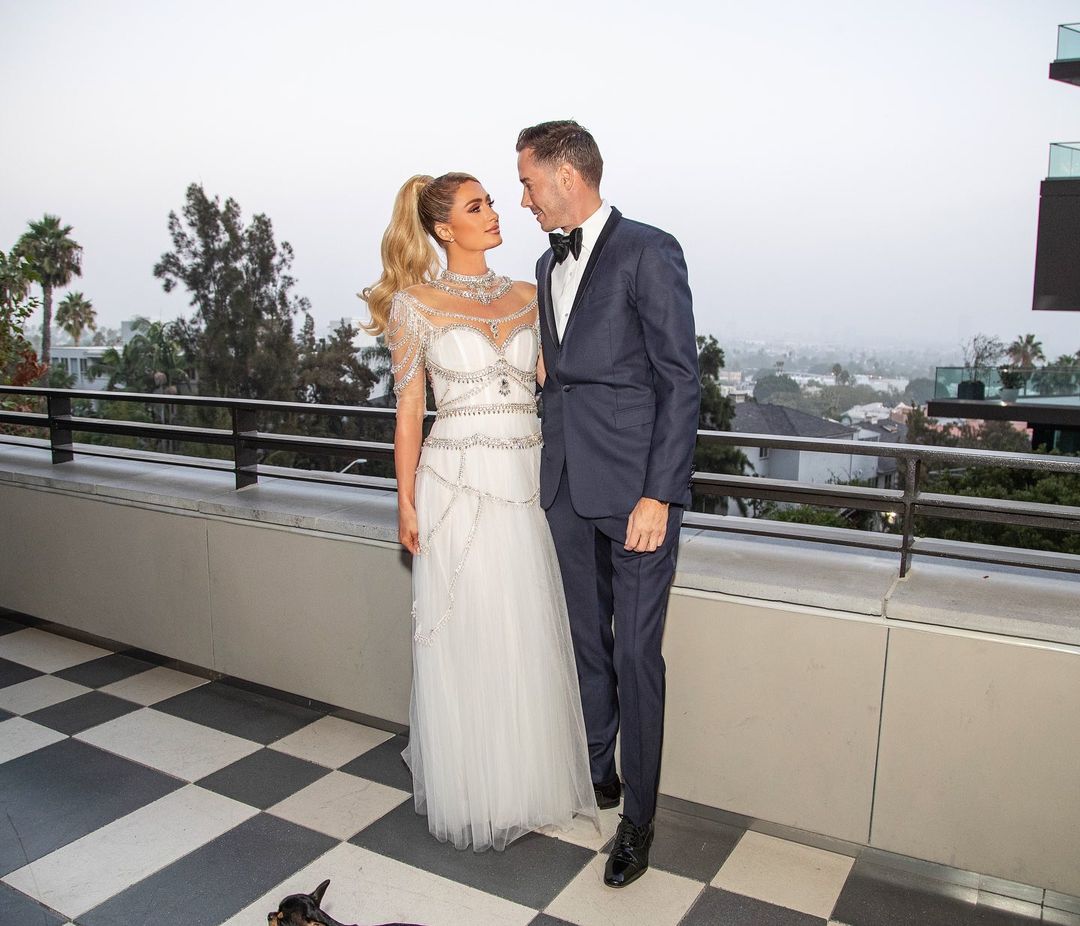 Под венец Пэрис пошла в свадебном платье Oscar de la Renta. Образ для знаменитости создали креативные директора модного дома Лаура Ким и Фернандо Гарсия. Обручальное кольцо для знаменитости создал американский ювелирный бренд Jean Dousset.