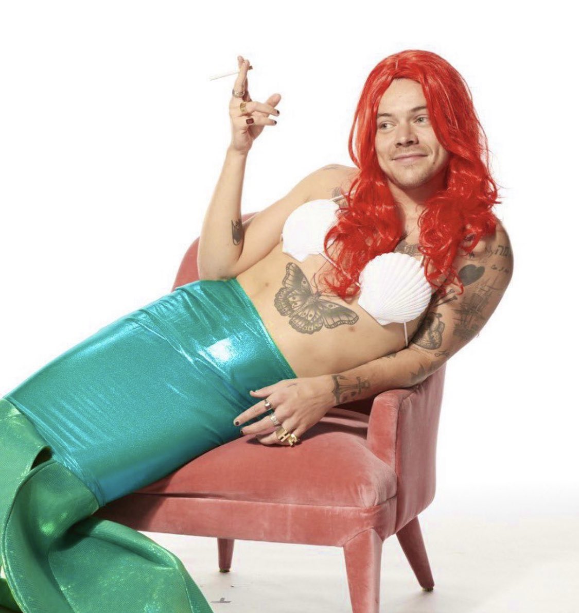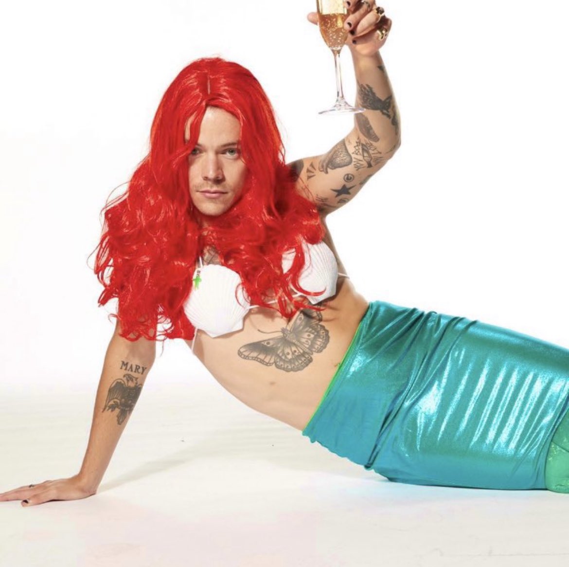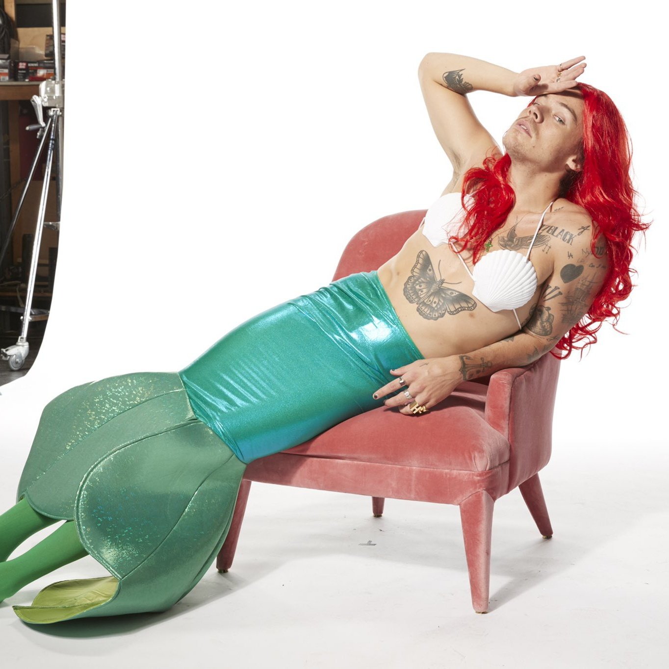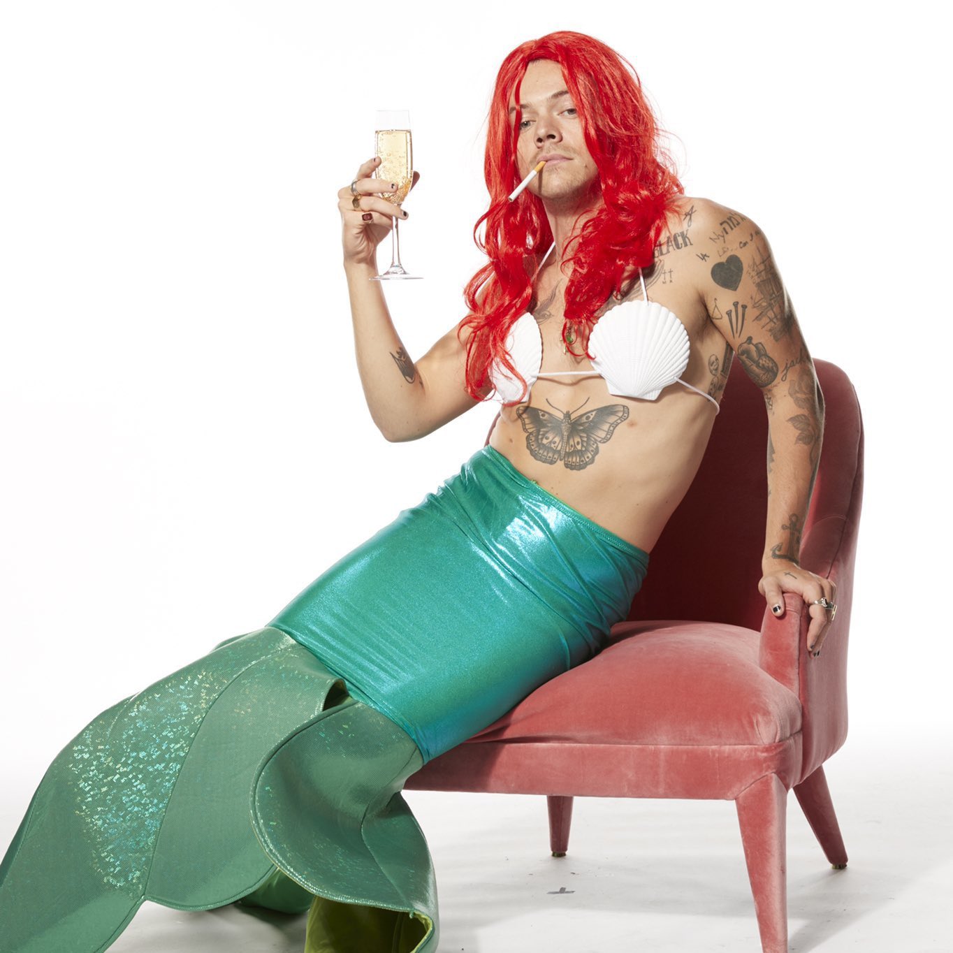 В Сети появились фото Гарри Стайлза в образе русалочки Ариэль. На фото артист примеряет костюм героини мультфильмов: бюстгальтер из морских ракушек, зеленый хвост и красный парик. В руках певец держит бокал шампанского и сигарету.